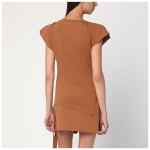 Isabel Marant caramel-coloured cotton T-shirt, characterized by an asymmetric design, boat neckline, structured shoulders with straps, short sleeves, logo lettering embroidery on the back, and side slit.