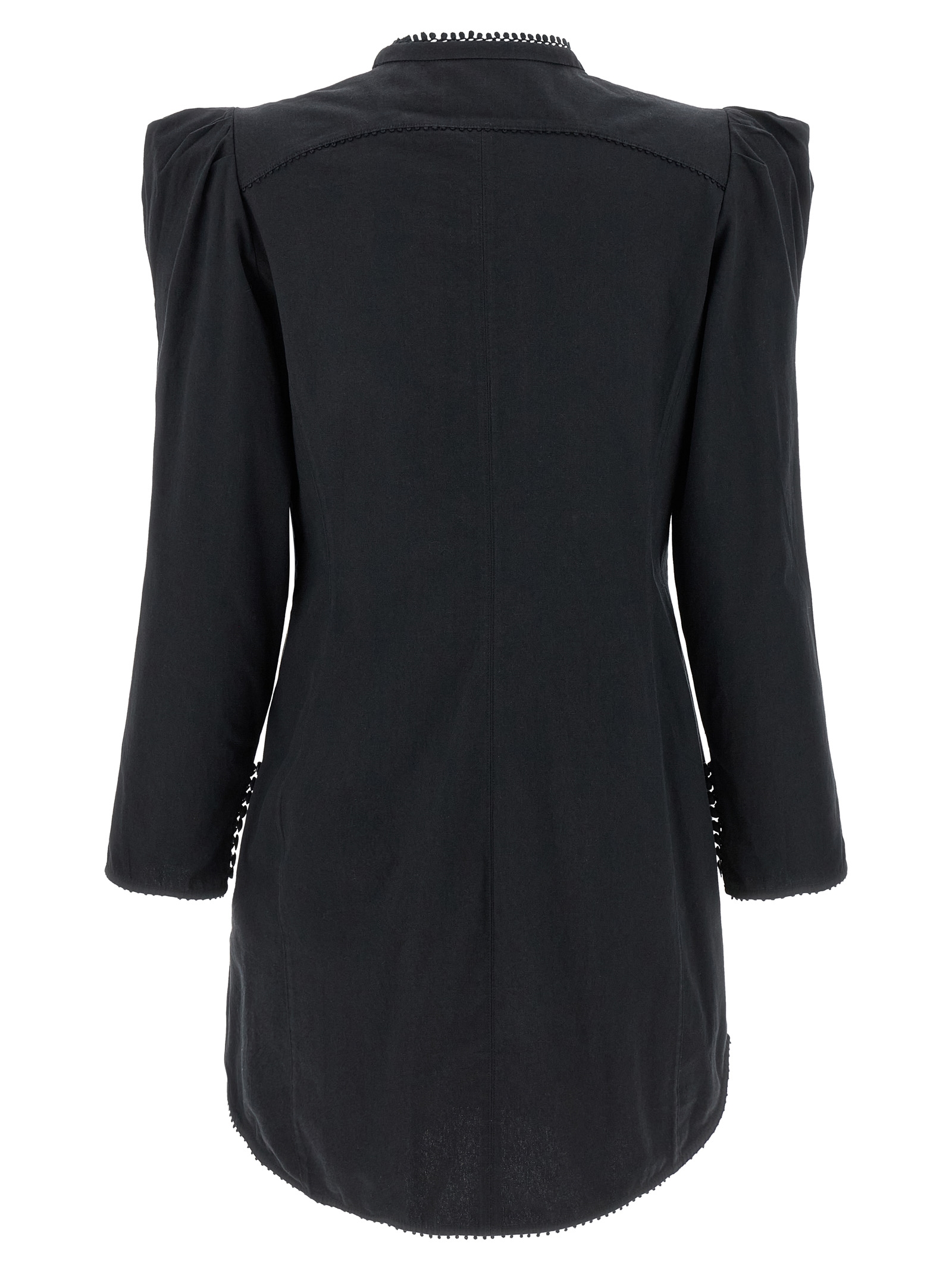 Victorian cotton mini ‘chantal’ dress with ruffle inserts, Mesh fretwork and crochet finish, Crew neck, Front button closure, Long puff sleeves with buttons and slit on the sleeve bottom.