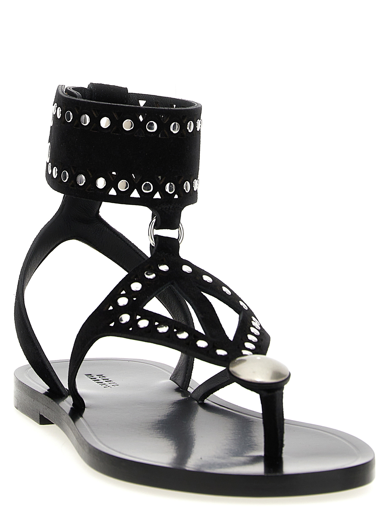 Edil’ suede sandals with cut-out details and all-over stud details, flip-flop style, adjustable strap with ankle snap buttons, leather sole.