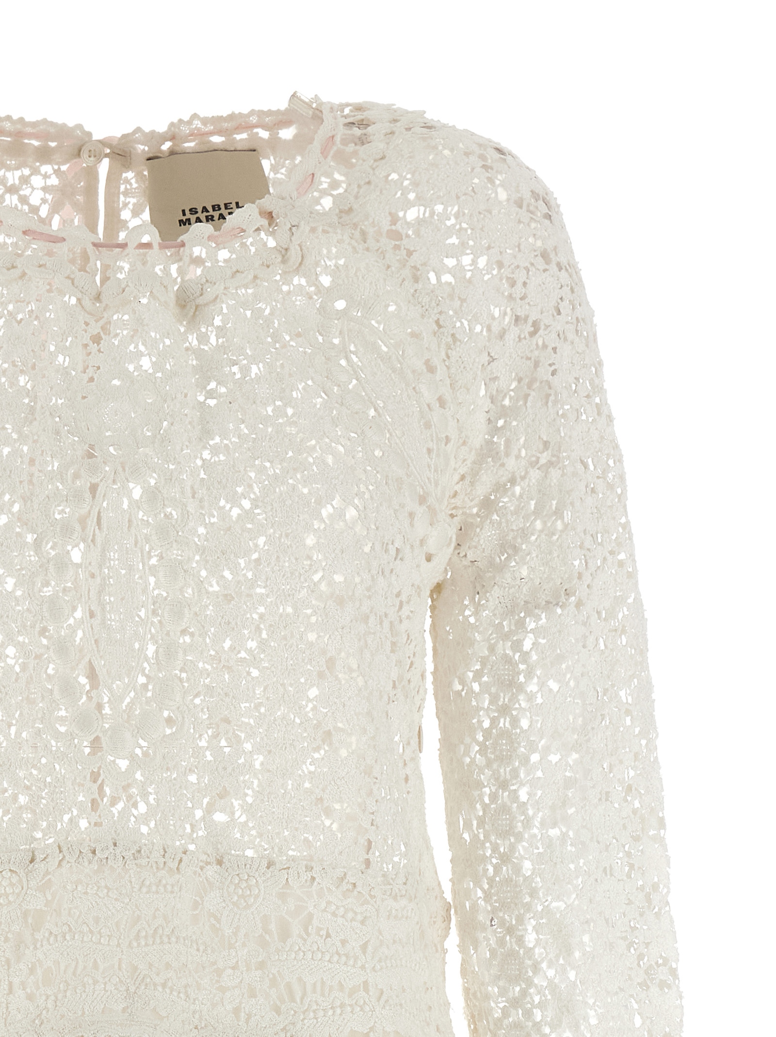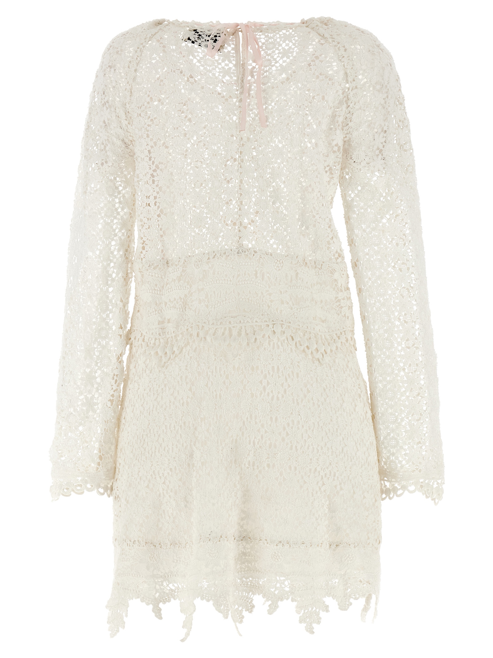 Mini ‘hizene’ crochet openwork cotton dress, Hourglass silhouette, Crew neck with button closure and contrast back lace and teardrop cut-out detail, Side zip closure, Long sleeves with flared and asymmetrical cuffs, Asymmetrical hem.