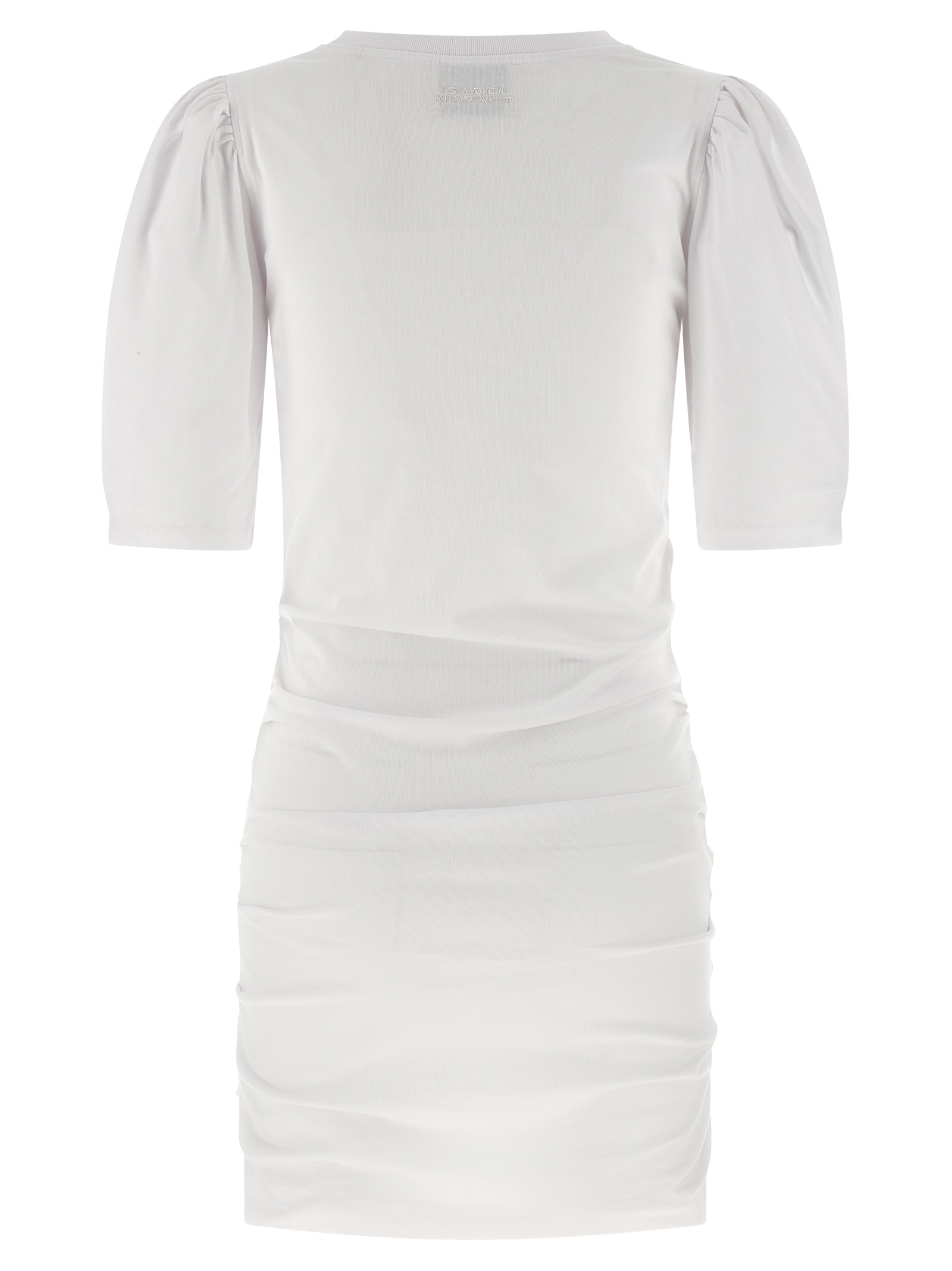 ‘Mylda’ cotton jersey mini dress with side draping, round neckline, 3/4 sleeves with gusset and crinkled shoulder, tone-on-tone logo embroidery at the back._x000D_