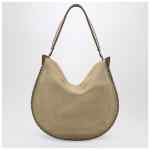 Isabel Marant beige suede leather shoulder bag featuring woven details, leather handle, engraved metal rings, magnetic closure, removable zip pouch with stud button and logo embossed on the front.