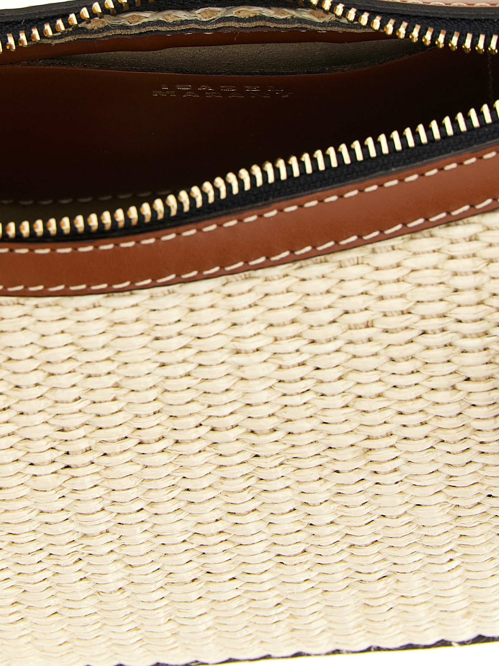‘oskan moon’ smooth leather shoulder bag with central insert on the front and back in contrasting woven raffia, Stud appliqué on the bottom of the bag, Contrast stitching, Top zip closure, Adjustable shoulder strap.