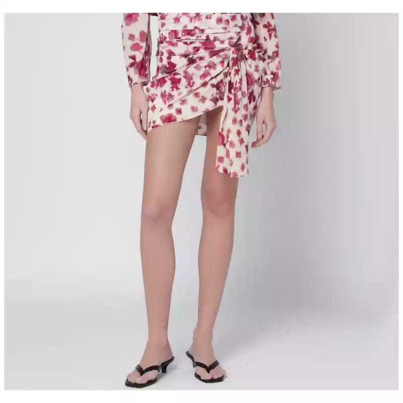 Mini skirt by Isabel Marant in stretch silk Multicolor print Draped design Fixed waistband Invisible side zip Large knotted front panel Asymmetric length. Size and Fit – Model wears size 36 FR Model measurements: Height: 182 cm Chest: 79 cm Waist: 62 cm Hips: 90 cm