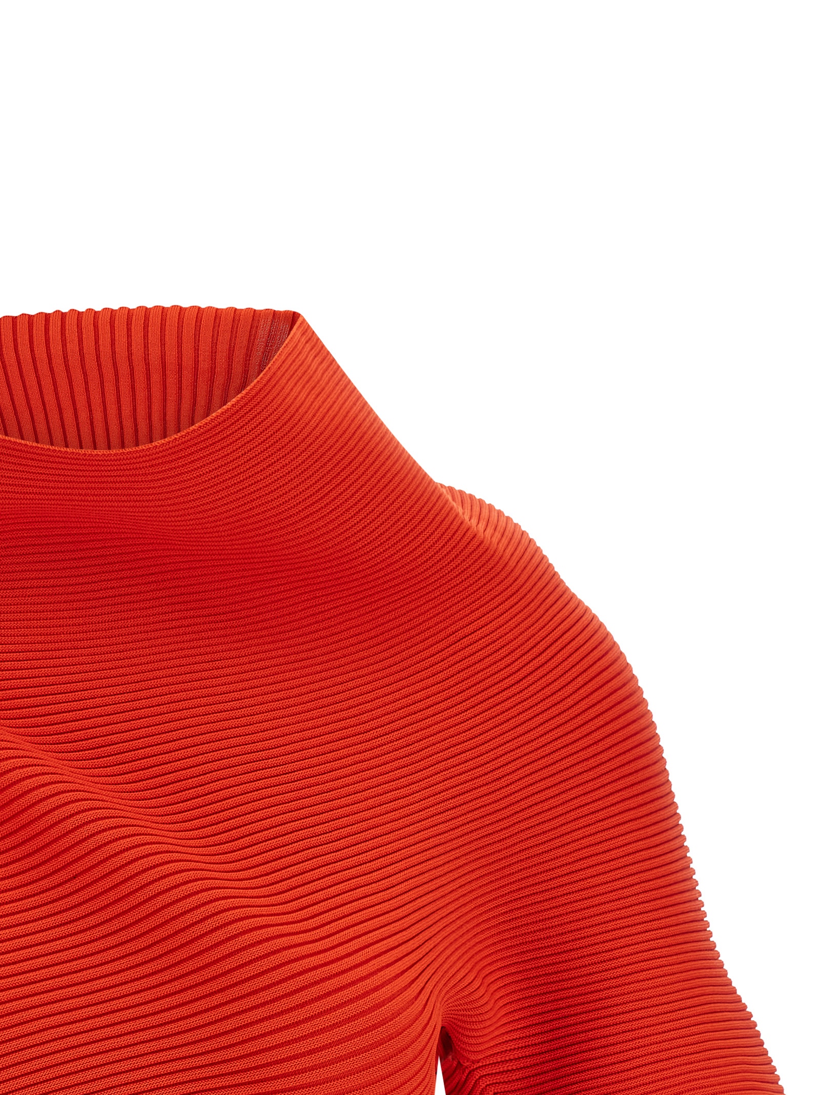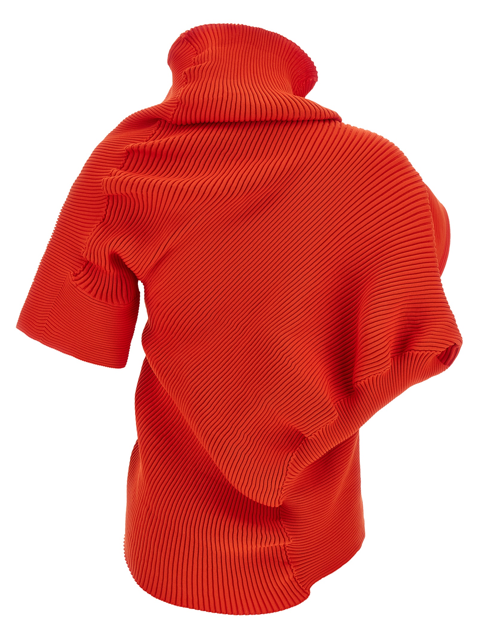 ‘life form’ stretch knit top with ribbed pattern, Tubular shapes, Asymmetric, Wide high neck and beveled short sleeves. Size and Fit – True to size fit