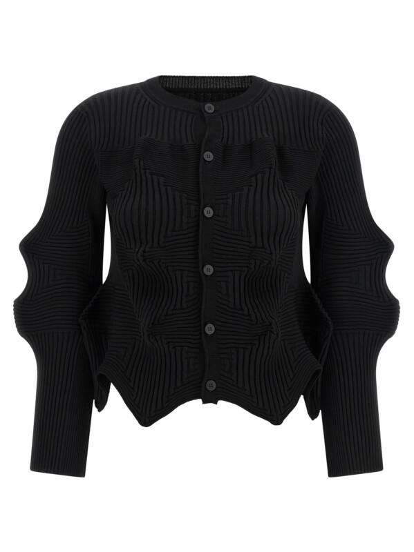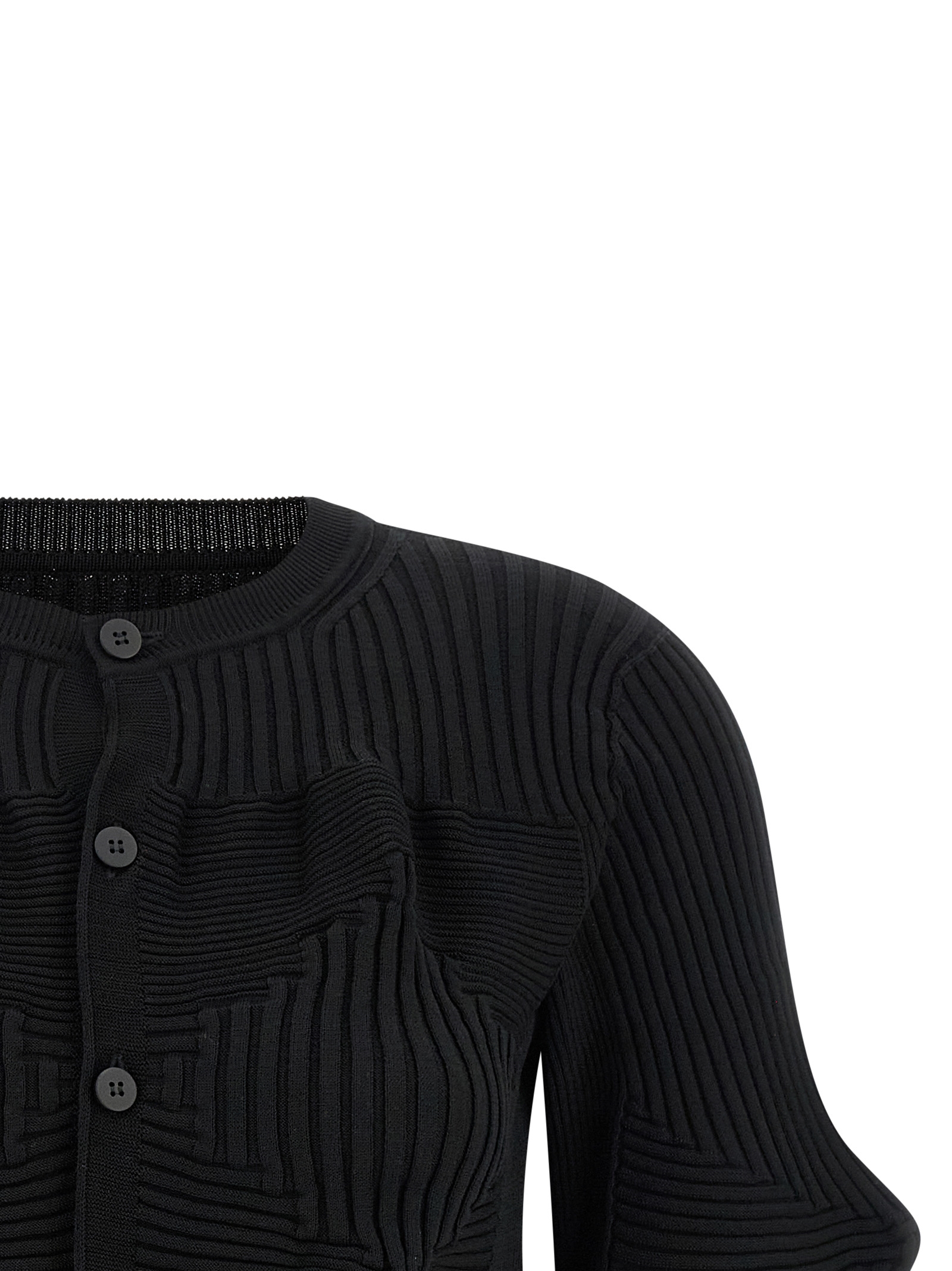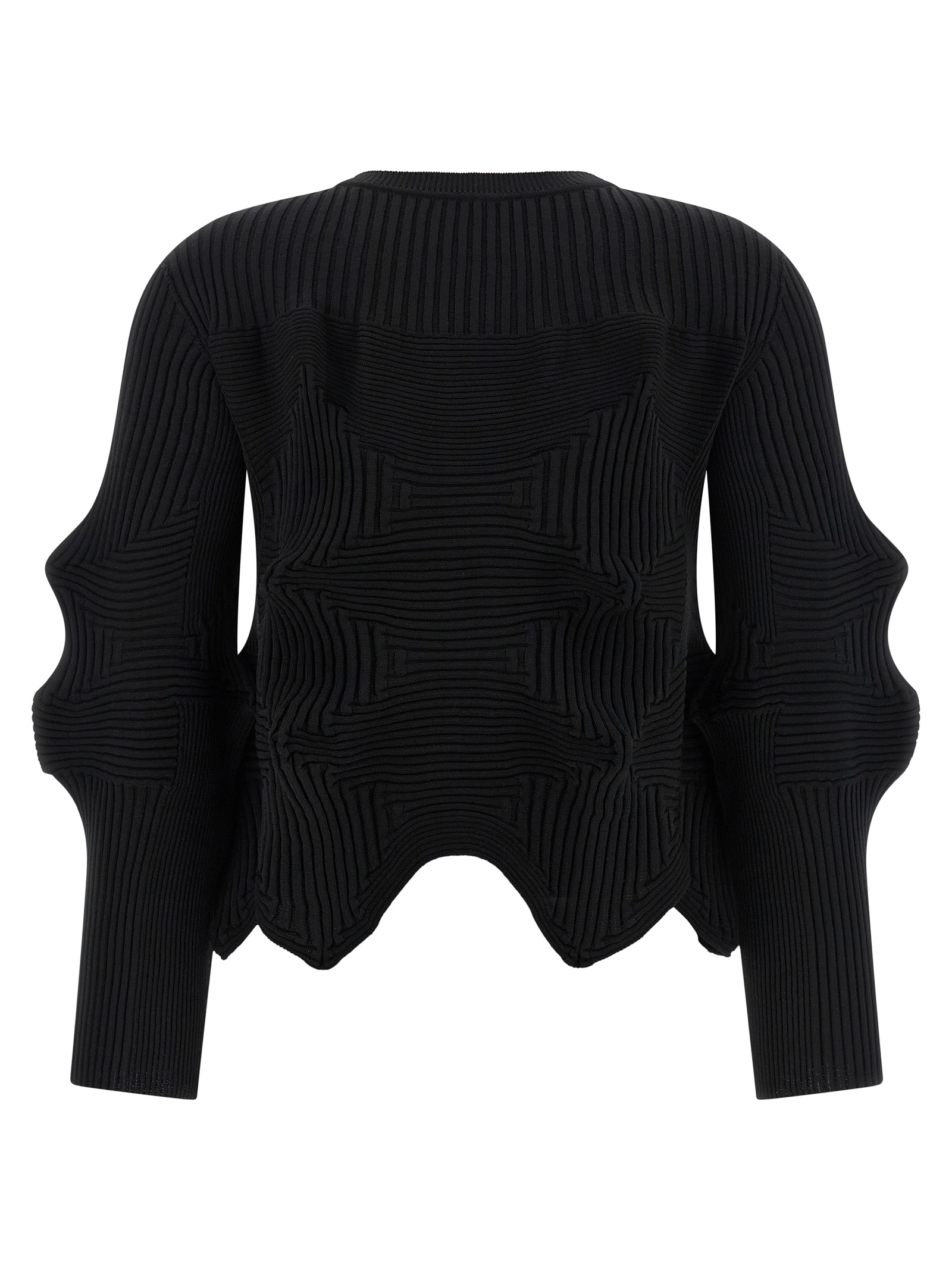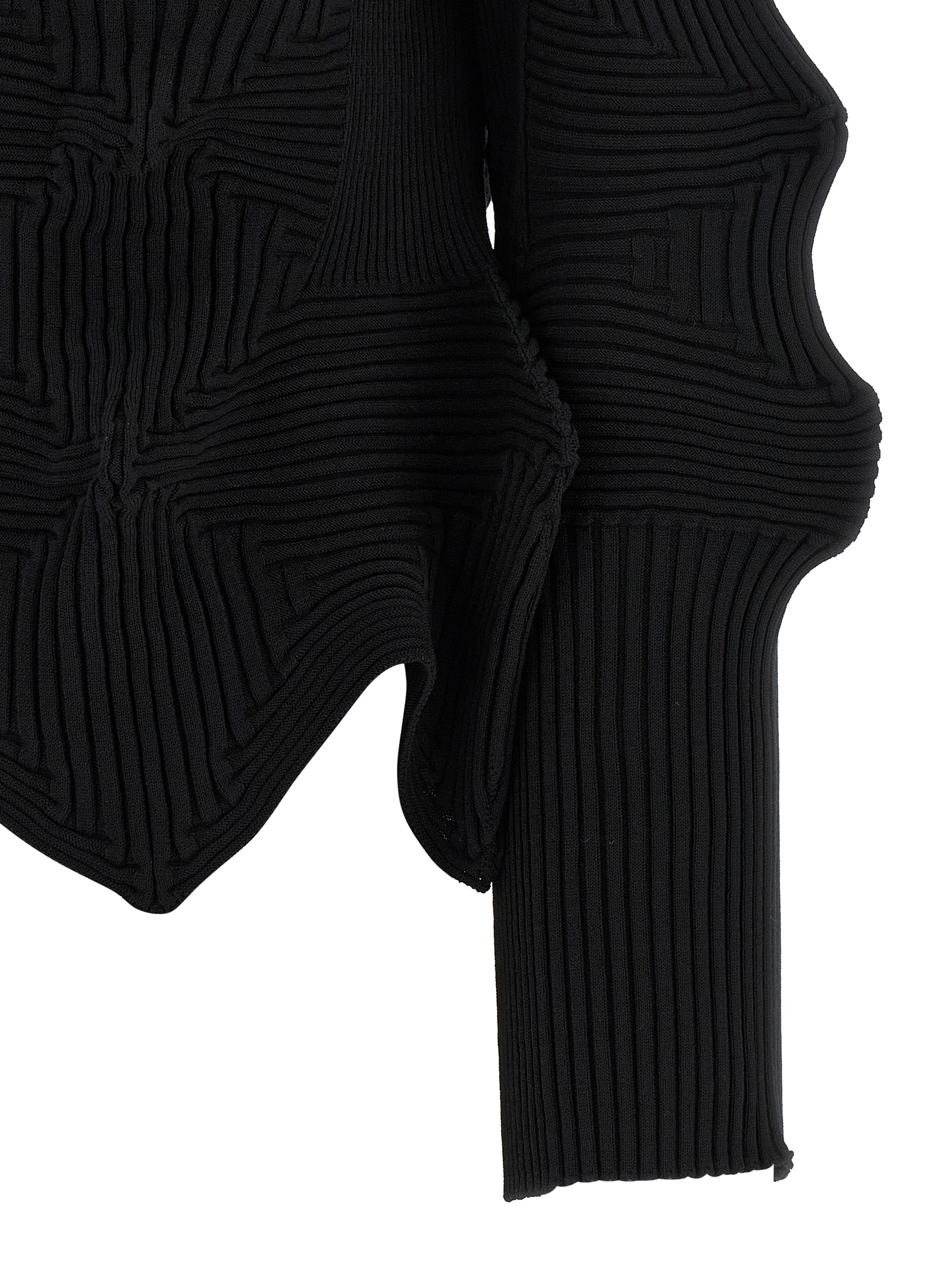 ‘linkage’ crewneck knit cropped top with elastic ribbed weave structure with asymmetric hem and short sleeves. Size and Fit – True to size fit