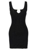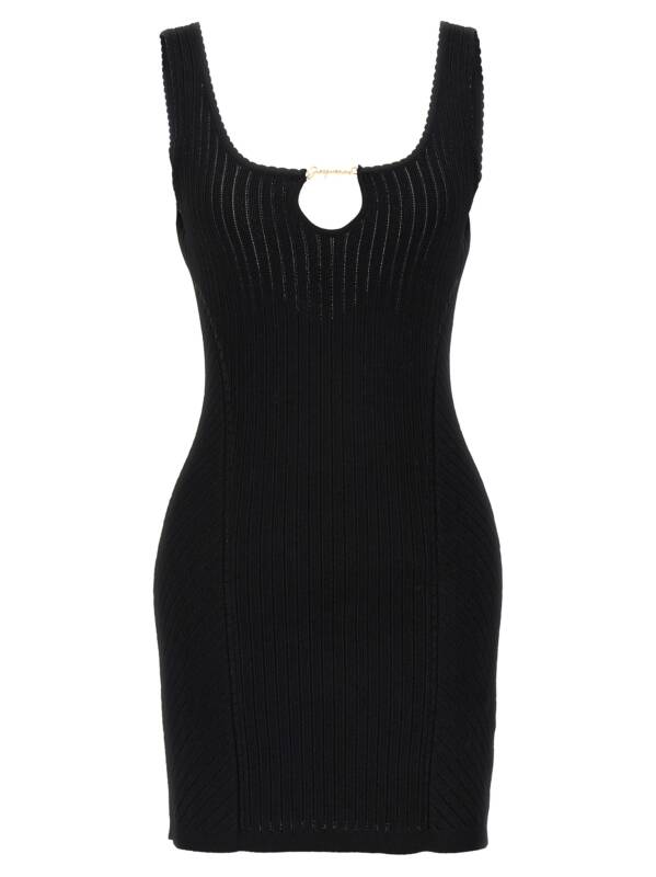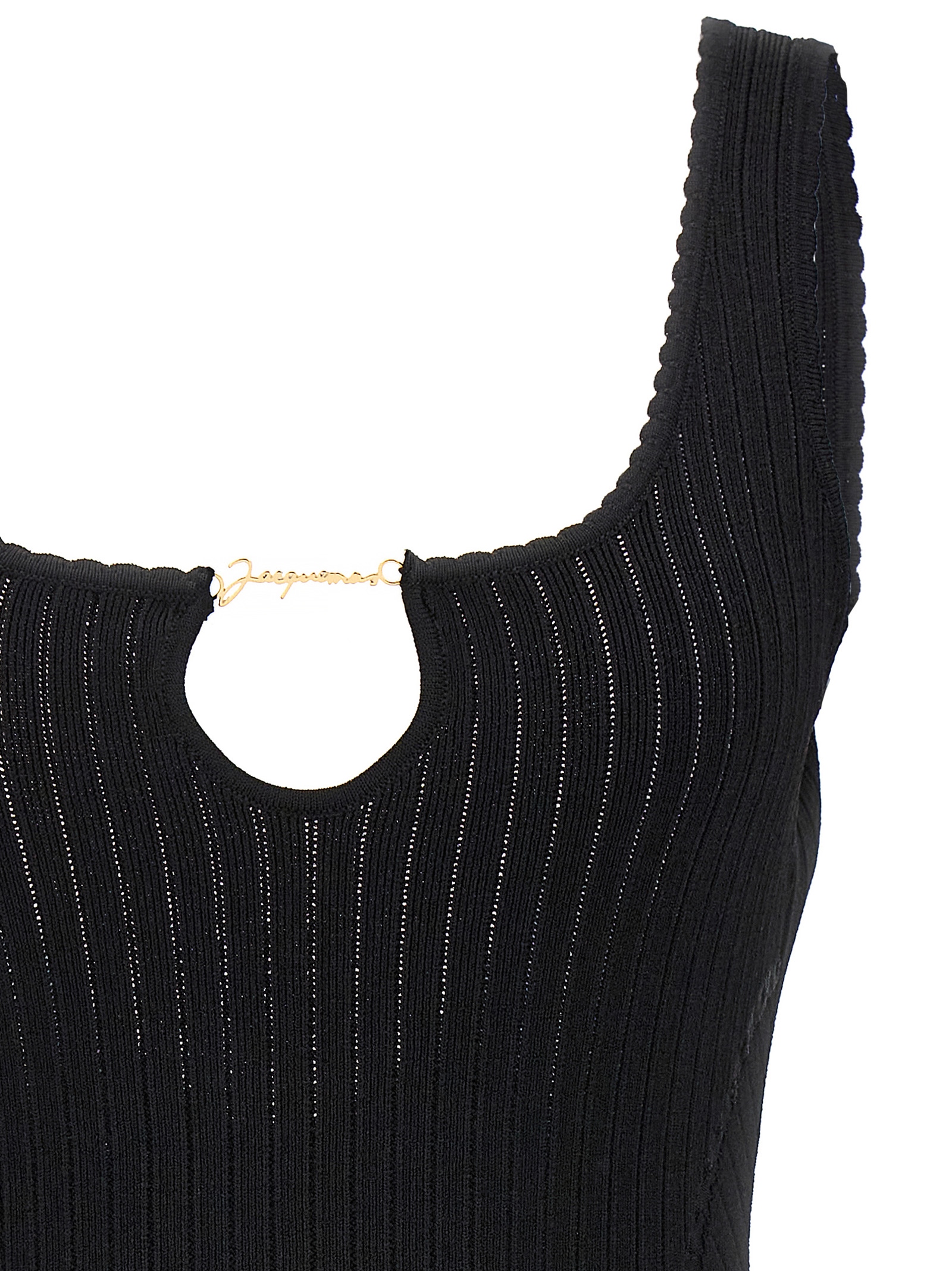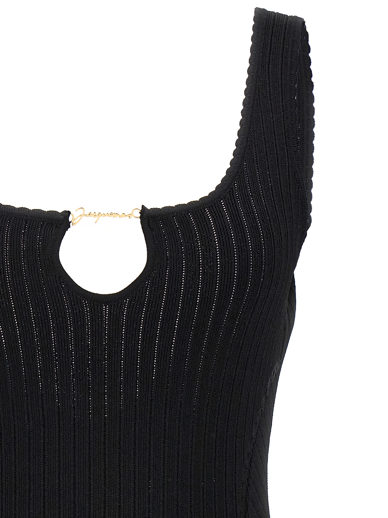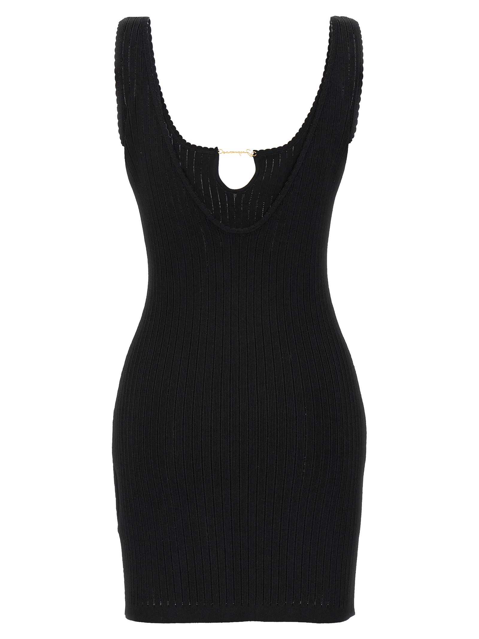 ‘la mini robe sierra’ dress in ribbed viscose blend with front cut-out detail with gold metal logo charm, Sleeveless. Size and Fit – True to size fit
