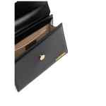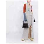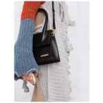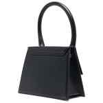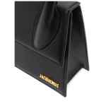 Black leather Le Grand Chiquito tote bag from JACQUEMUS featuring single rounded top handle, gold-tone logo lettering, tonal stitching, adjustable detachable shoulder strap, foldover top with magnetic fastening, internal logo patch and internal slip pocket. Le Grand Chiquito leather handbag