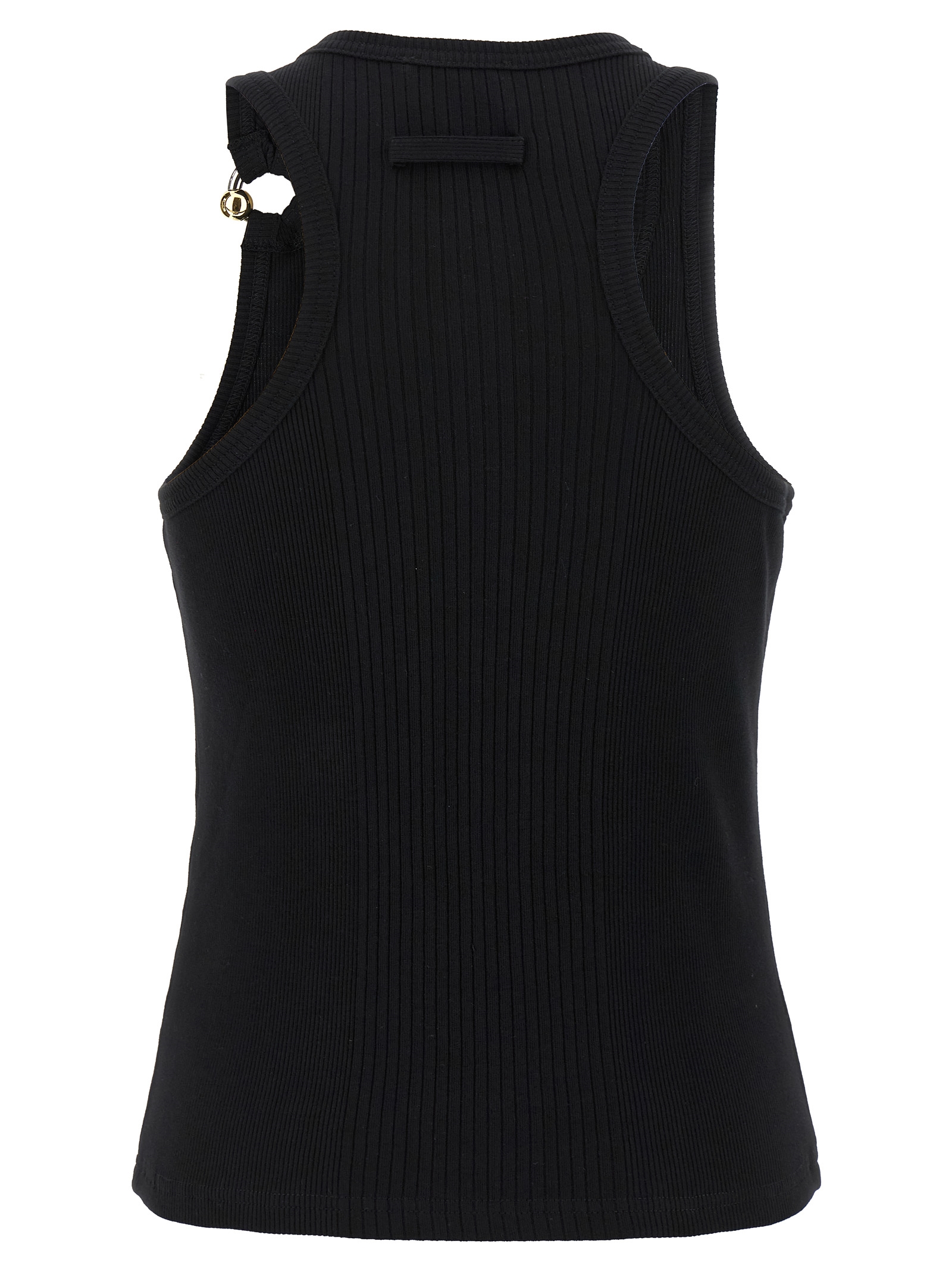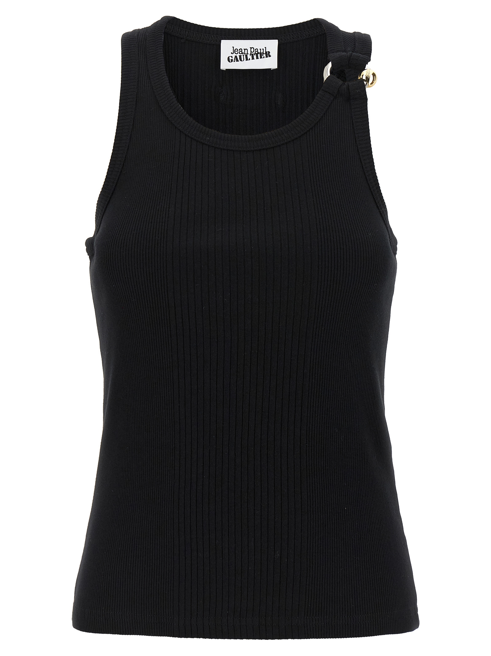 Ribbed stretch cotton tank top with ‘Black Piercing’ detail on the left shoulder strap, round neckline.