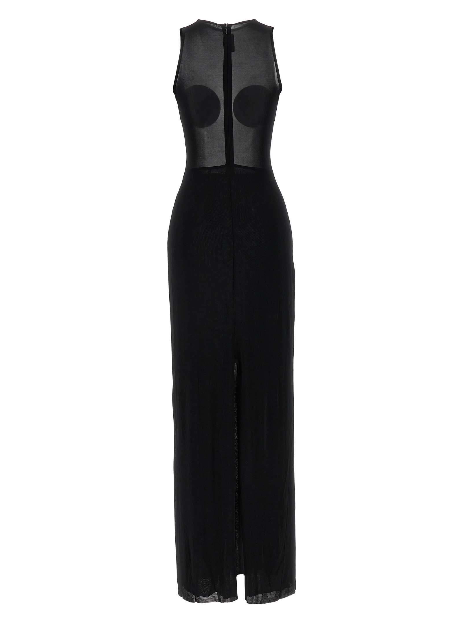 Long ‘The Black Conical’ tulle dress with semi-transparent upper part with conical detail on the breast, crew neck, zip closure and back split, underskirt.