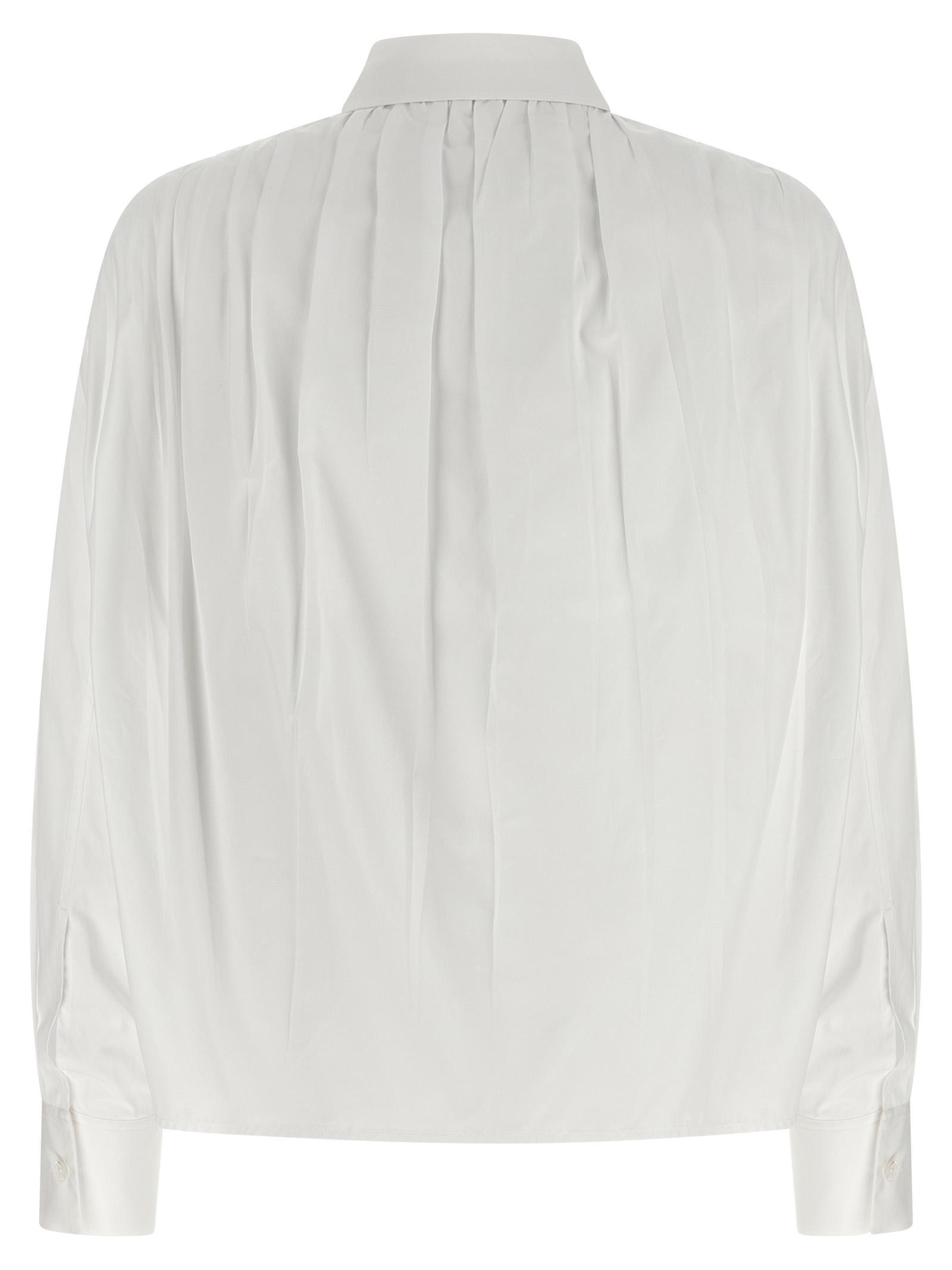 ‘136’ shirt in double cotton poplin with ruffled shoulders with front and back pliers, Slightly crop style, Concealed front button closure, Long cuffed sleeves.