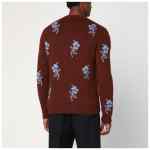 Jil Sander round-neck sweater in a blend of alpaca and virgin wool in brick colour with blue floral embroidery, ribbed cuffs and hem.