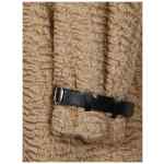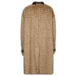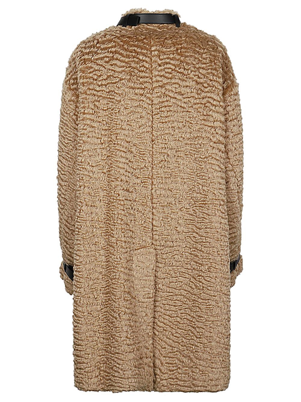 Long beige coat, solid colour, long sleeves with straps on the wrists, mandarin neckline with belt, front button closure, back vent, internal lining. Wool coat