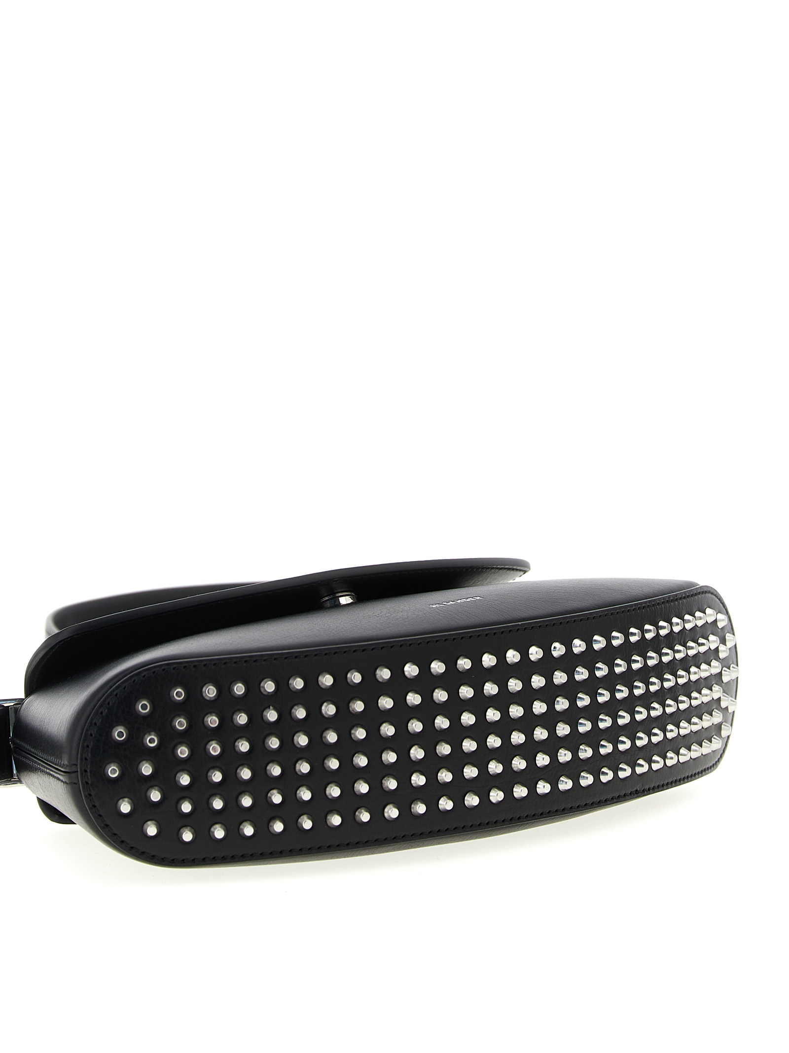Small leather ‘Eldorado’ shoulder strap with front embossed logo, curved base with metal stud applications, magnetic flap closure, adjustable handle with metal buckle.