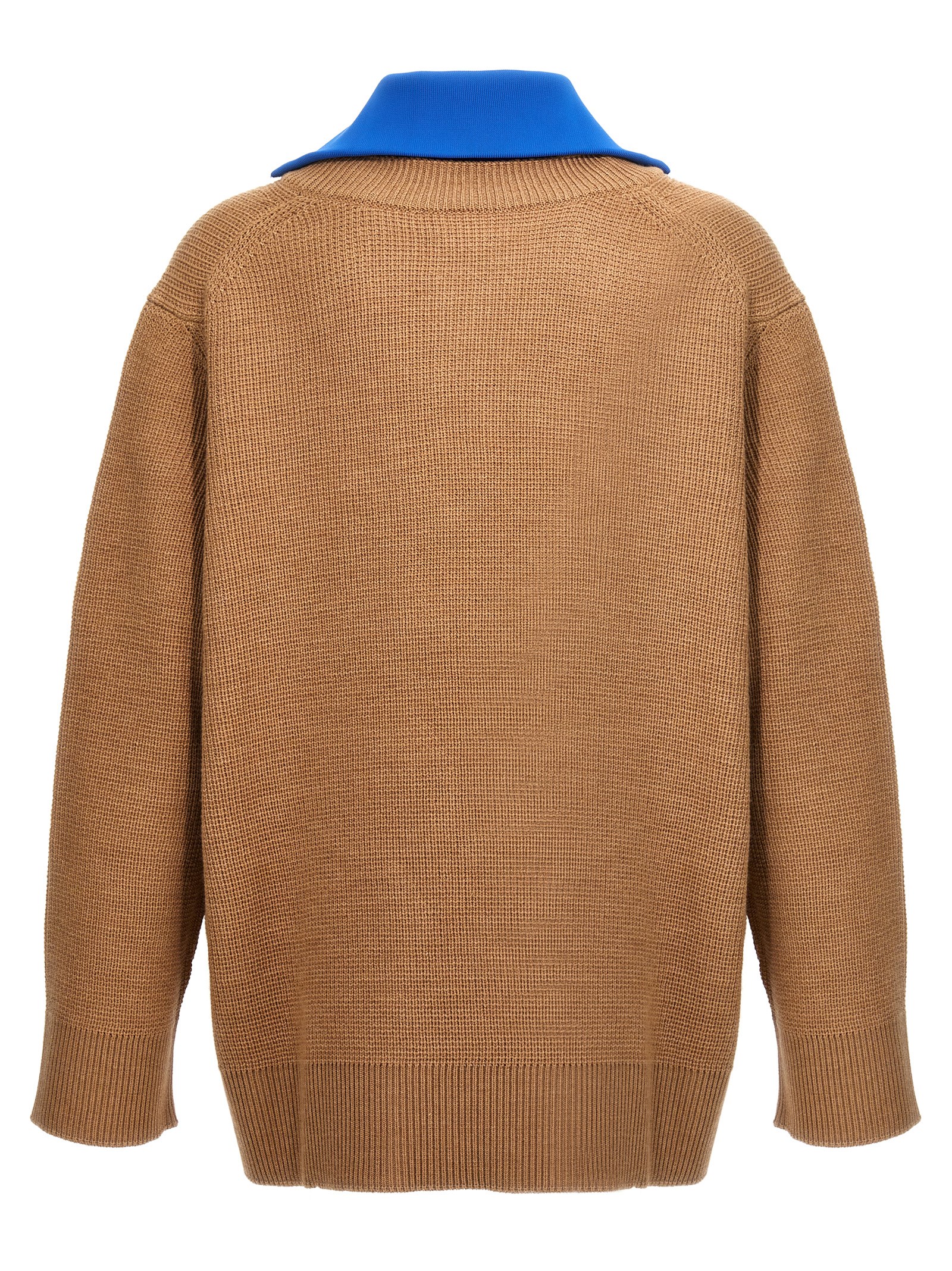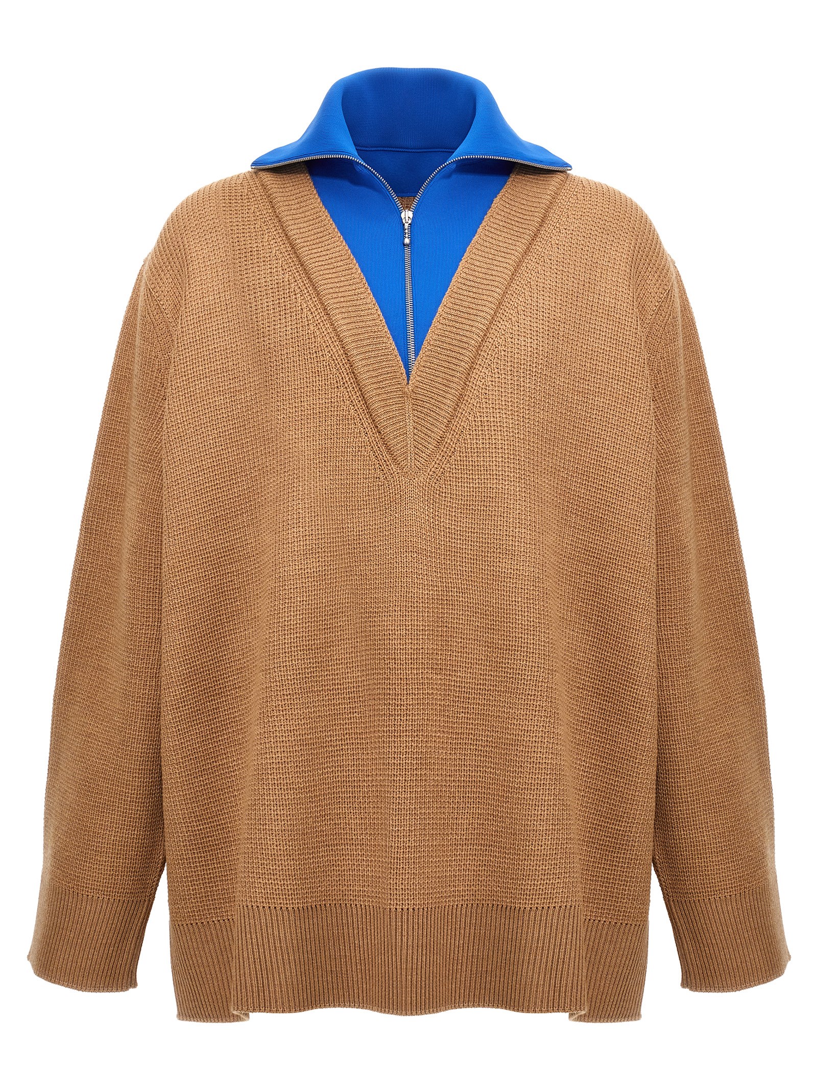 Wool blend sweater with V-neck with fleece insert and half zip, high neck, long sleeves.