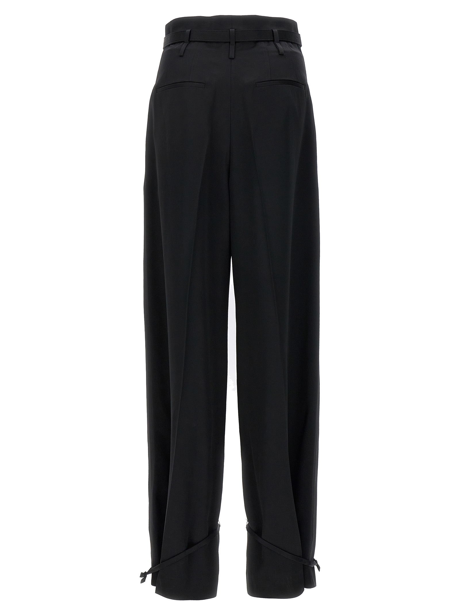 Tailored trousers with loose leg but with the possibility of tightening the ankle through straps, front pences, high waist. Equipped with removable and adjustable belt.