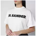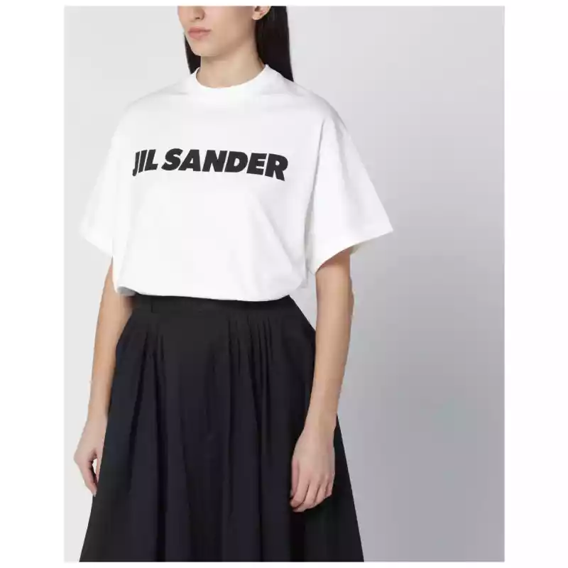 T shirt by Jil Sander in white cotton Wide short sleeves Contrasting logo print on the chest. Size and Fit – Model wears size S Model measurements: Height: 179 cm Chest: 82 cm Waist: 65 cm Hips: 90 cm