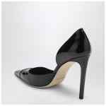 Pumps by Jimmy Choo in black patent leather, featuring pointed design, stitched strap and high stiletto heel.
