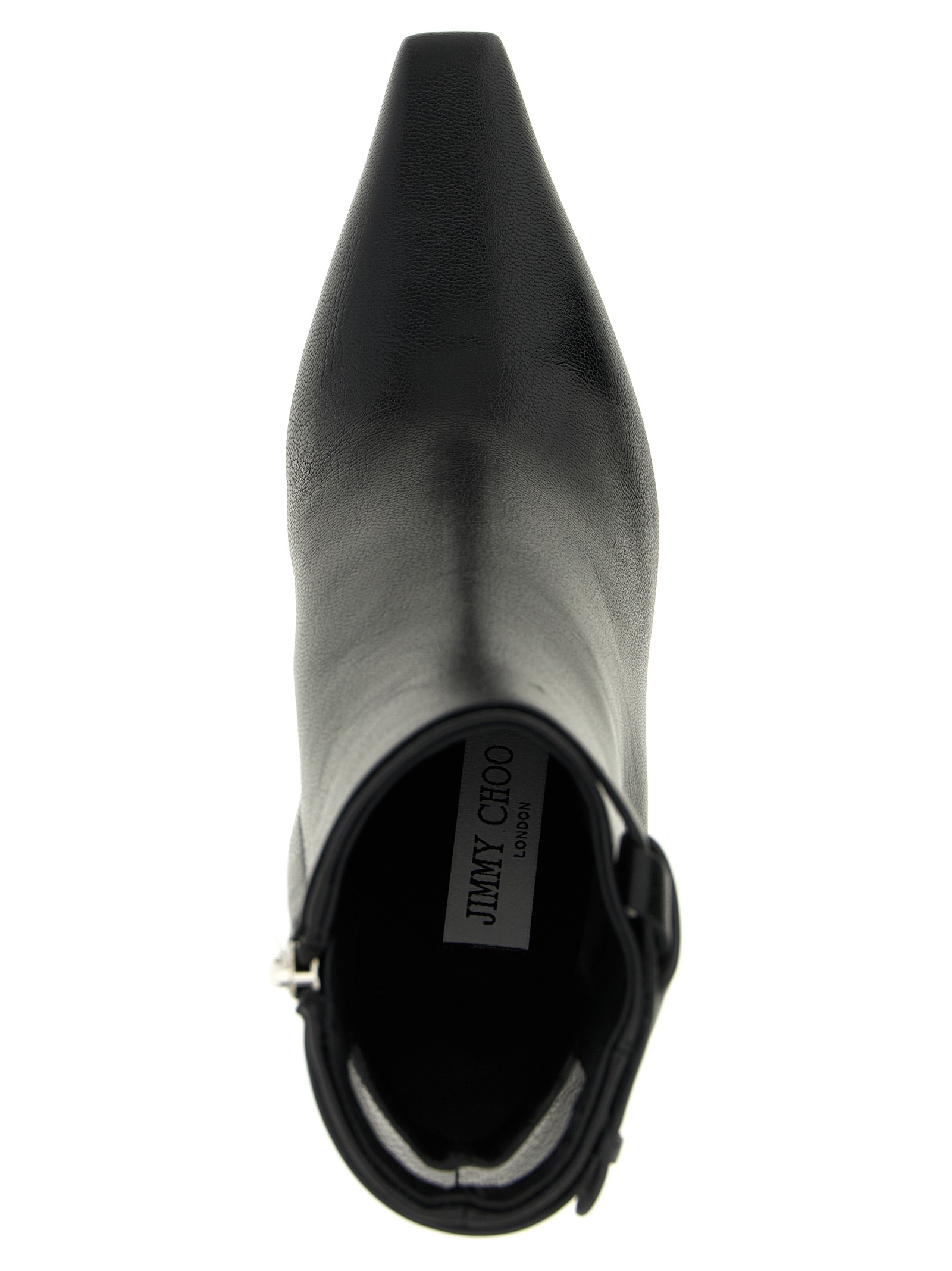 ‘Camie’ shiny kidskin leather ankle boots with square toe, back cut-out detail with strap, side zip closure, stiletto heel, leather sole.