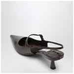 Chocolate brown crocodile effect leather slingback décolleté by Jimmy Choo, featuring a pointed design, buckle strap closure, elasticized strap at the back, stiletto heel, and leather sole.