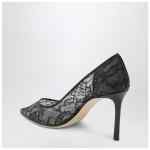 Pumps by Jimmy Choo in black lace, featuring pointed design, leather lining, high stiletto heel and leather sole.