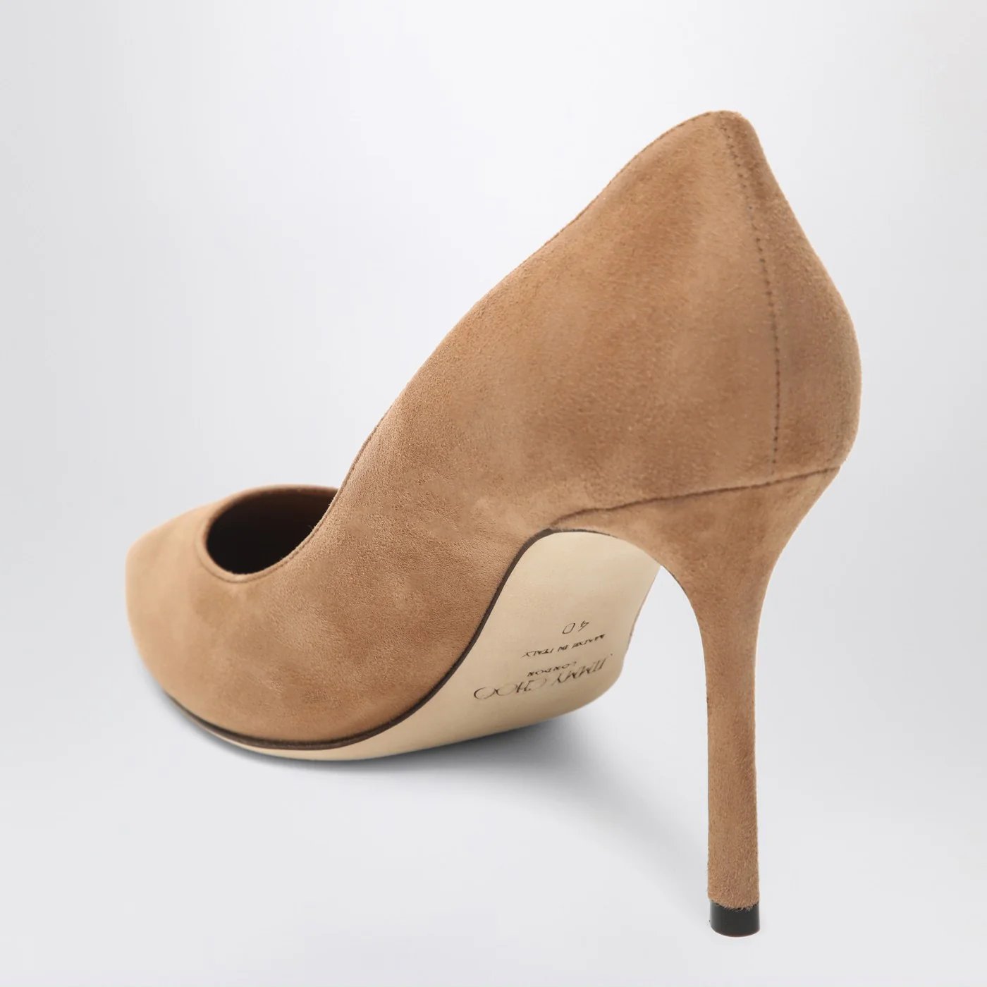 Toffee-coloured suede Jimmy Choo pumps featuring a pointed design stiletto heel and leather sole.
