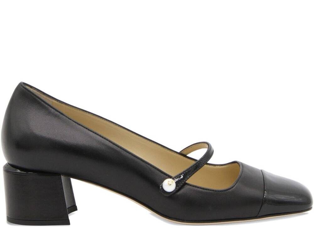 black leather upper mary jane strap pearl embellishment square toe block heel Elisa patent leather pumps