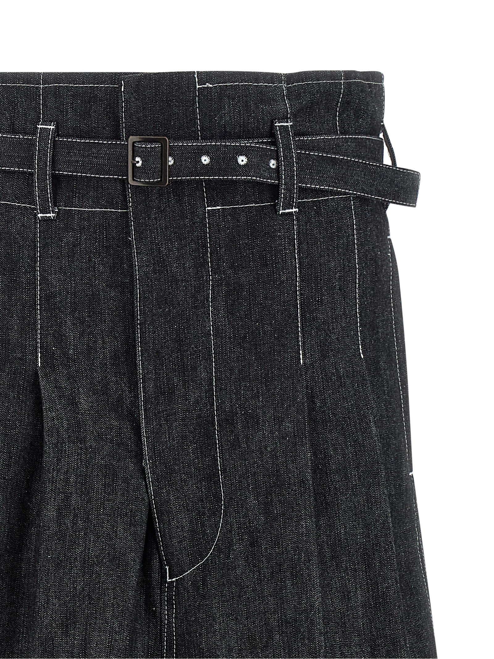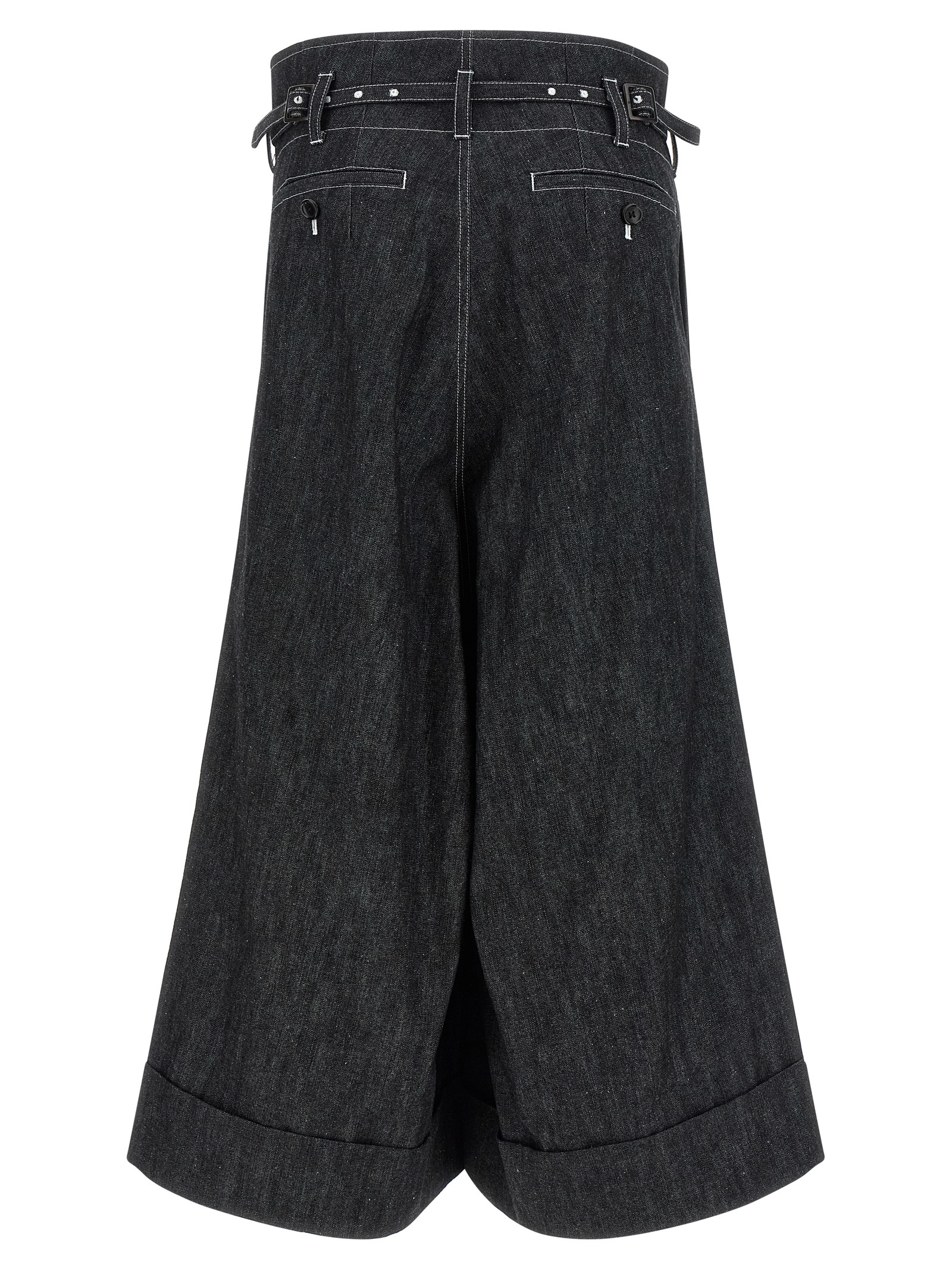 Cotton denim jeans with contrast stitching, High waist with bag construction, Crop model, Low crotch, Wide flared leg, Pins, Front zip and hook closure, Pockets, Turn-up on the leg bottom, Removable matching belt. Size and Fit – true to size fit