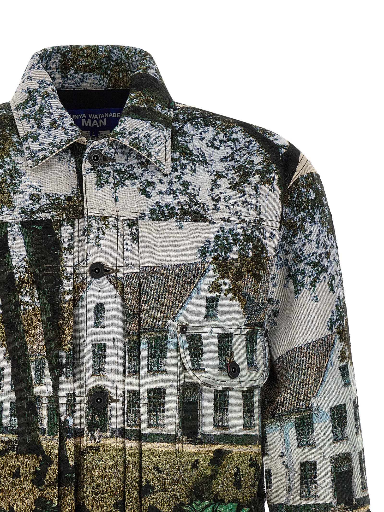 Cotton blend jacket with jacquard pattern, Frayed details, Front and back pincers, Shirt collar, Front metal button closure, Pockets, Long sleeves with cuffs, Unlined. Size and Fit – true to size fit