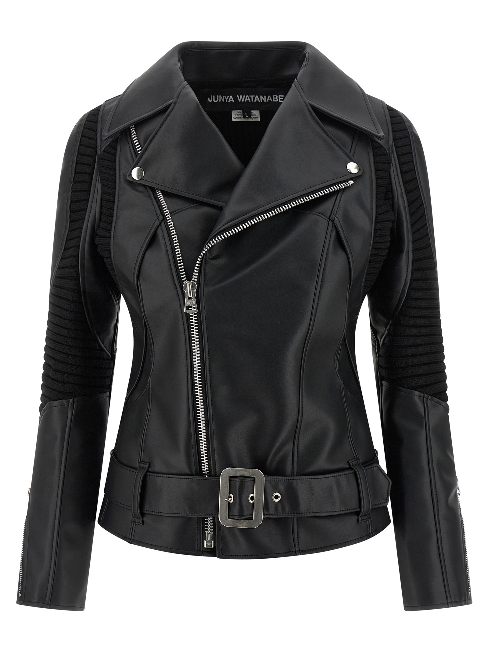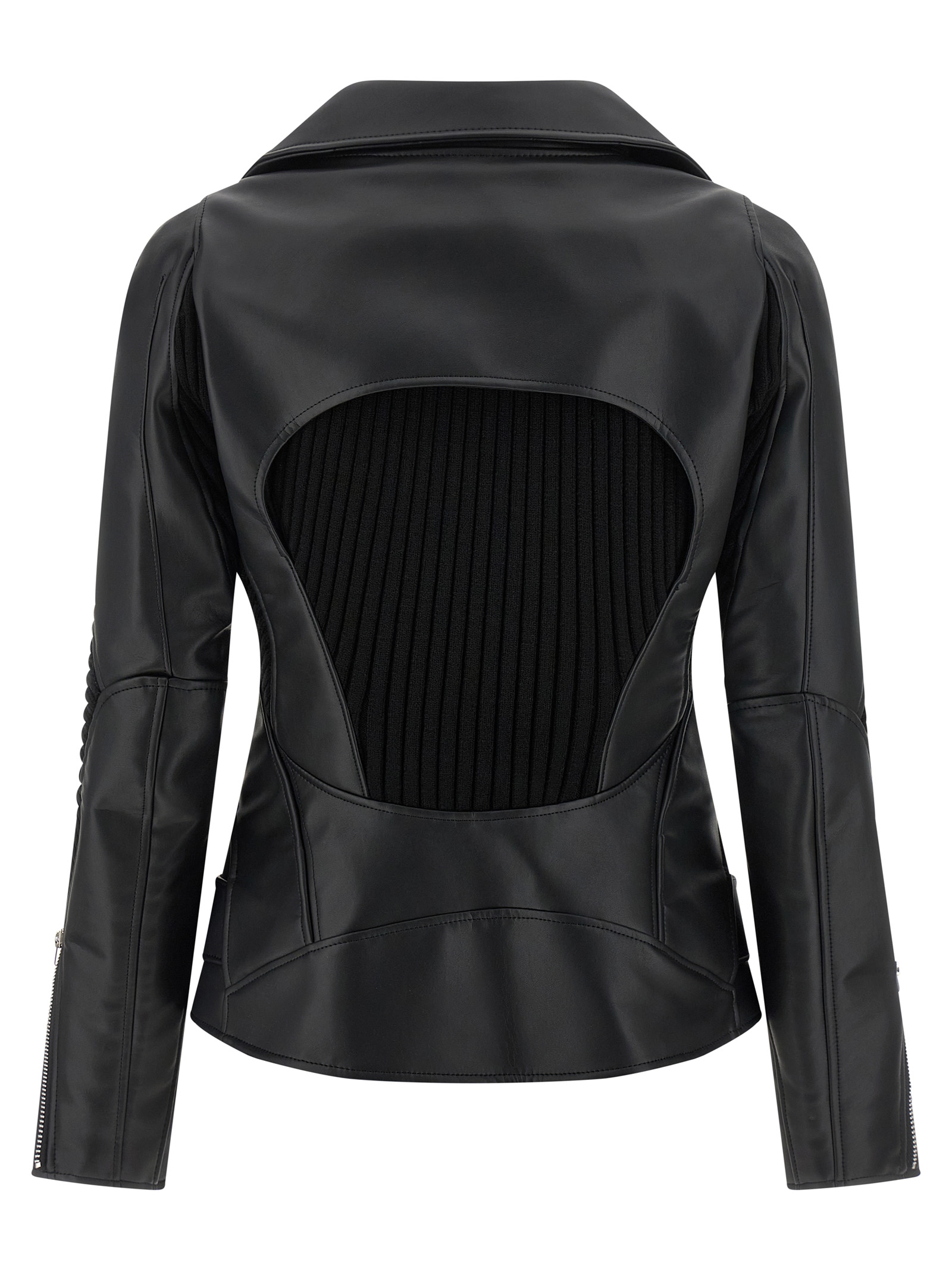 Leather-effect jacket with cut-out details and stretch ribbed knit inserts, front asymmetric zip closure, pockets, long sleeves with zip on the cuffs, and removable belt.