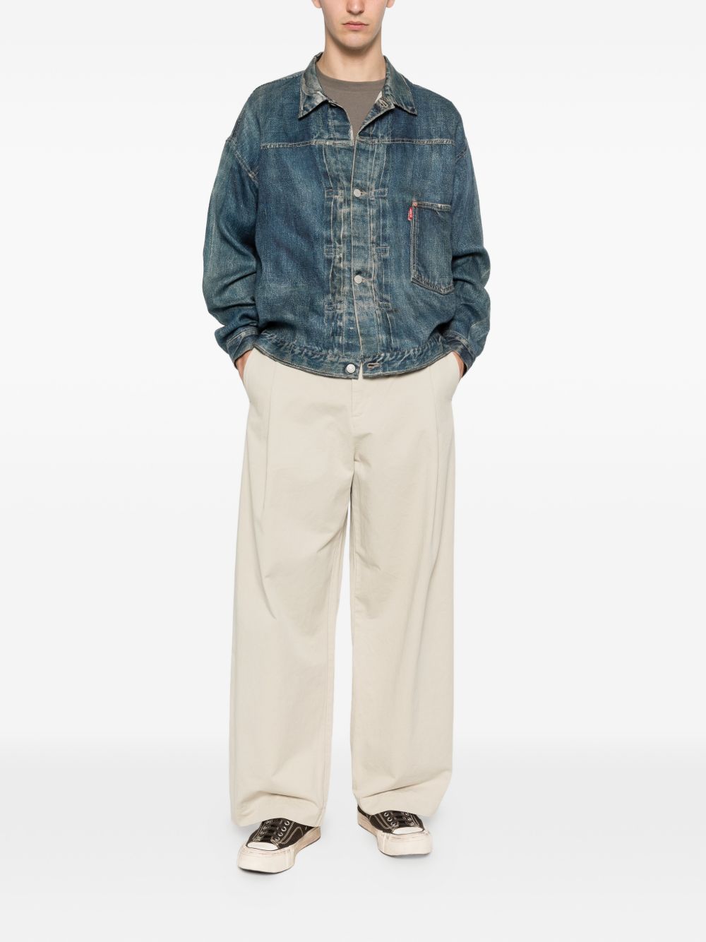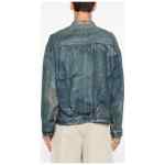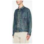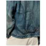 blue faded effect classic collar front button fastening long sleeves chest patch pocket buttoned cuffs cinch strap to the rear Linen jacket.