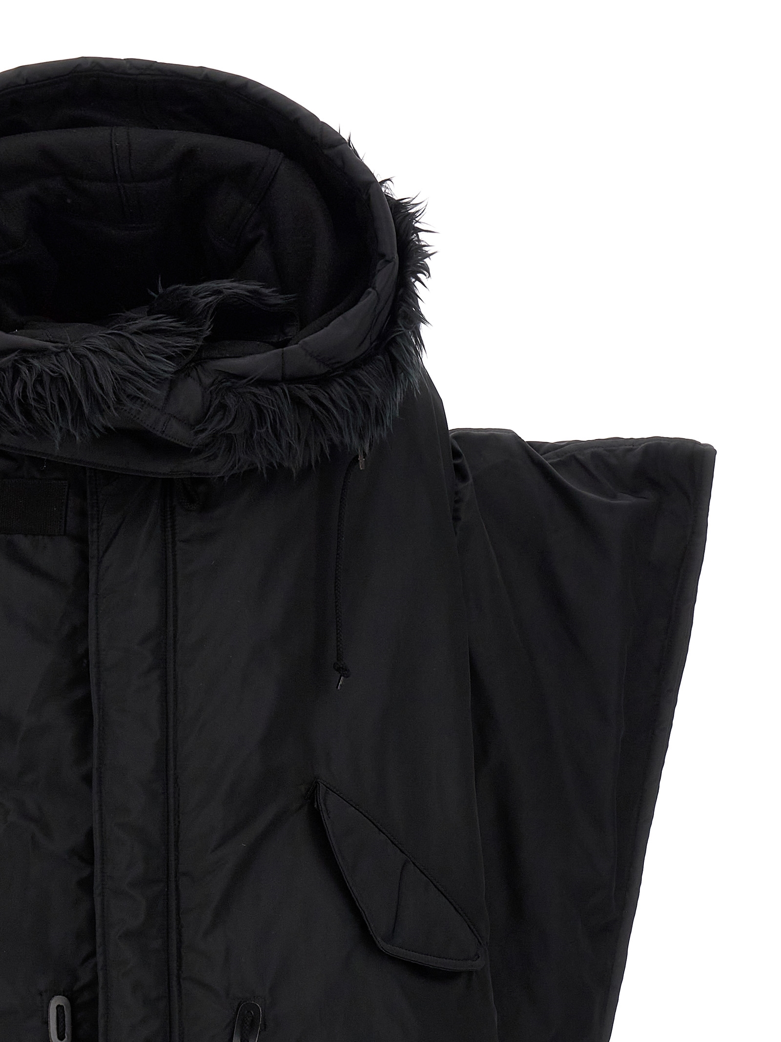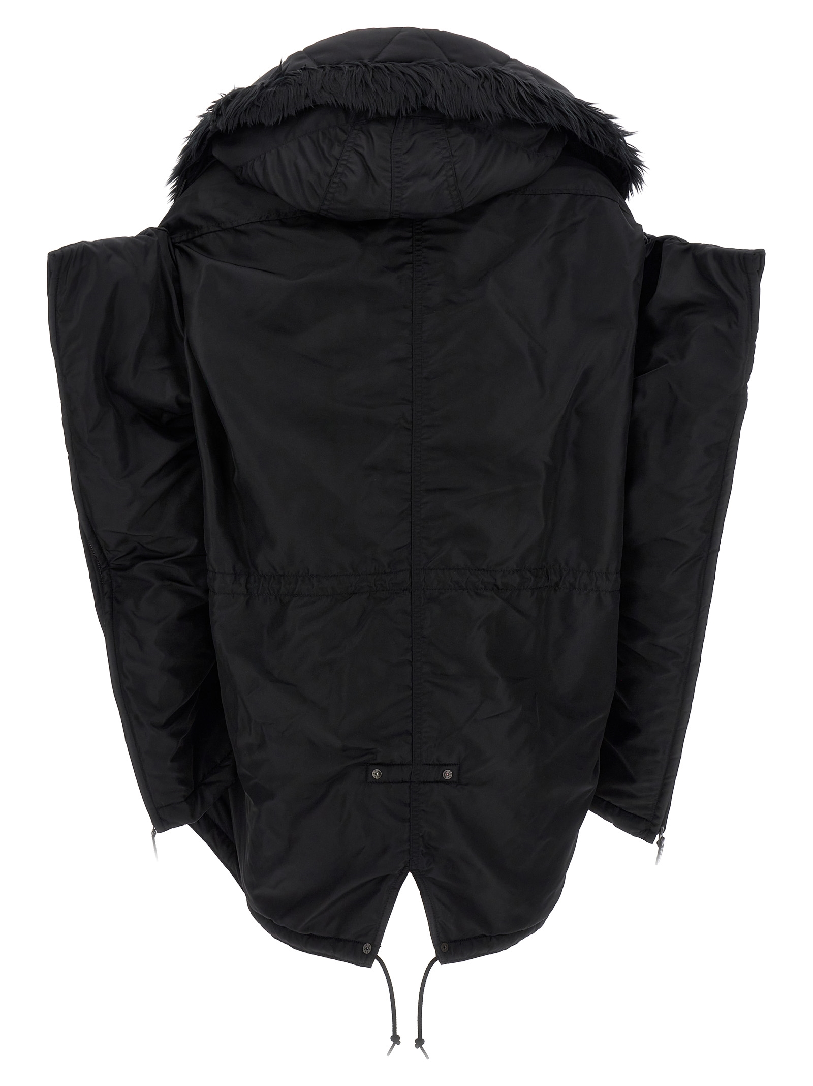 Oversize nylon down jacket with removable hood with faux fur insert, zip and button closure, pockets, long sleeves with opening zip, adjustable drawstring at the hem.