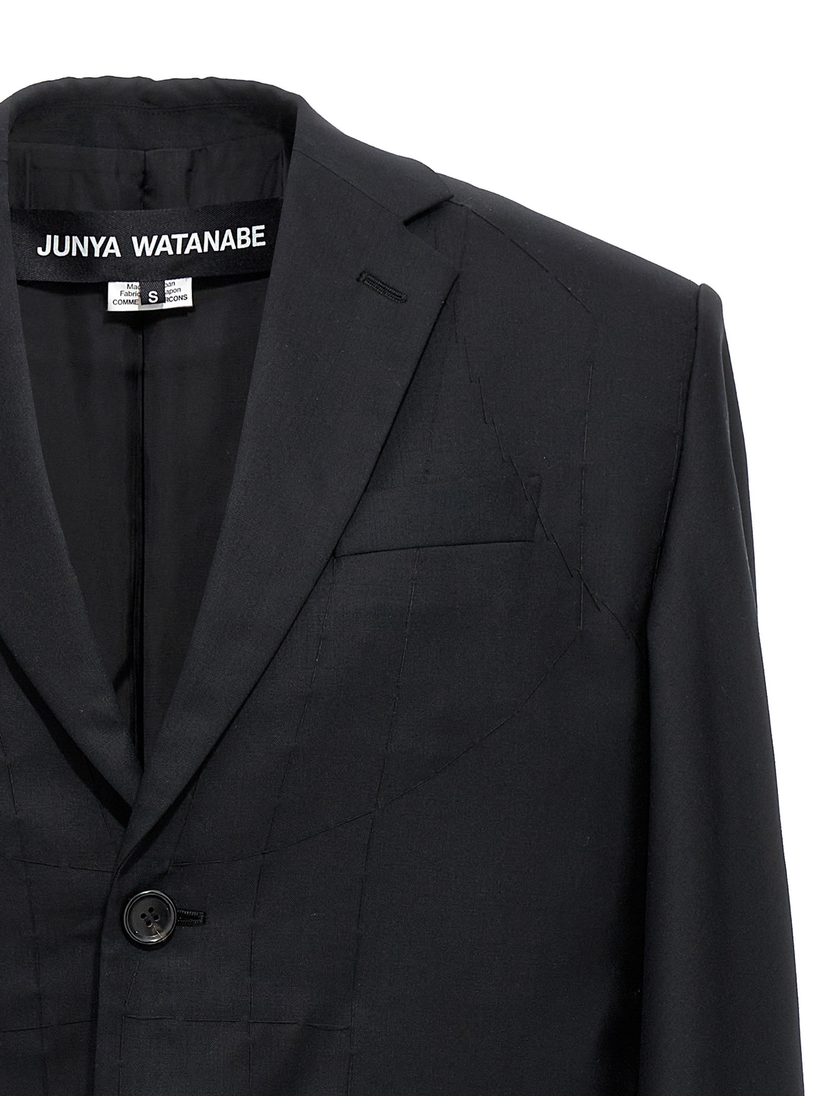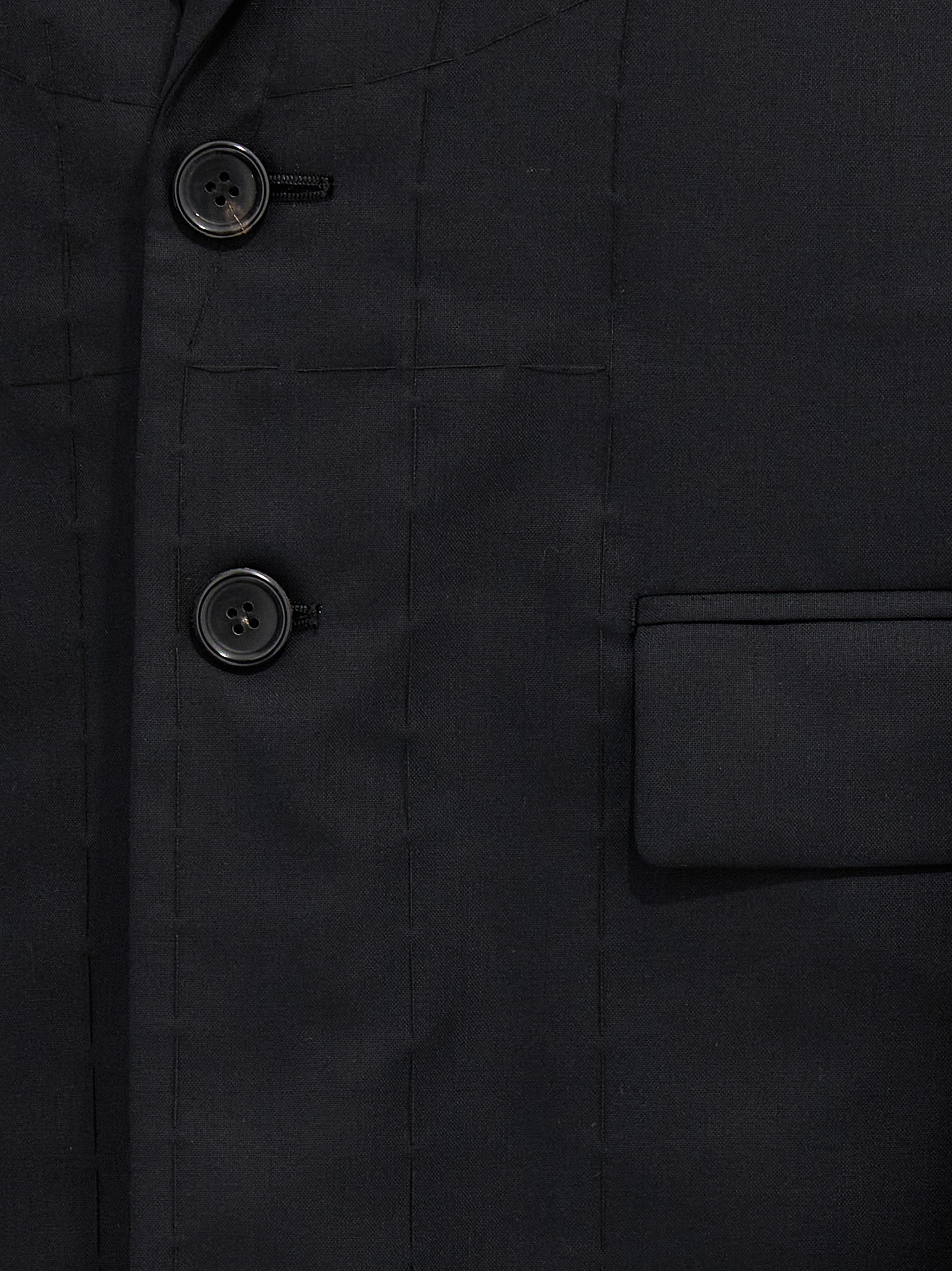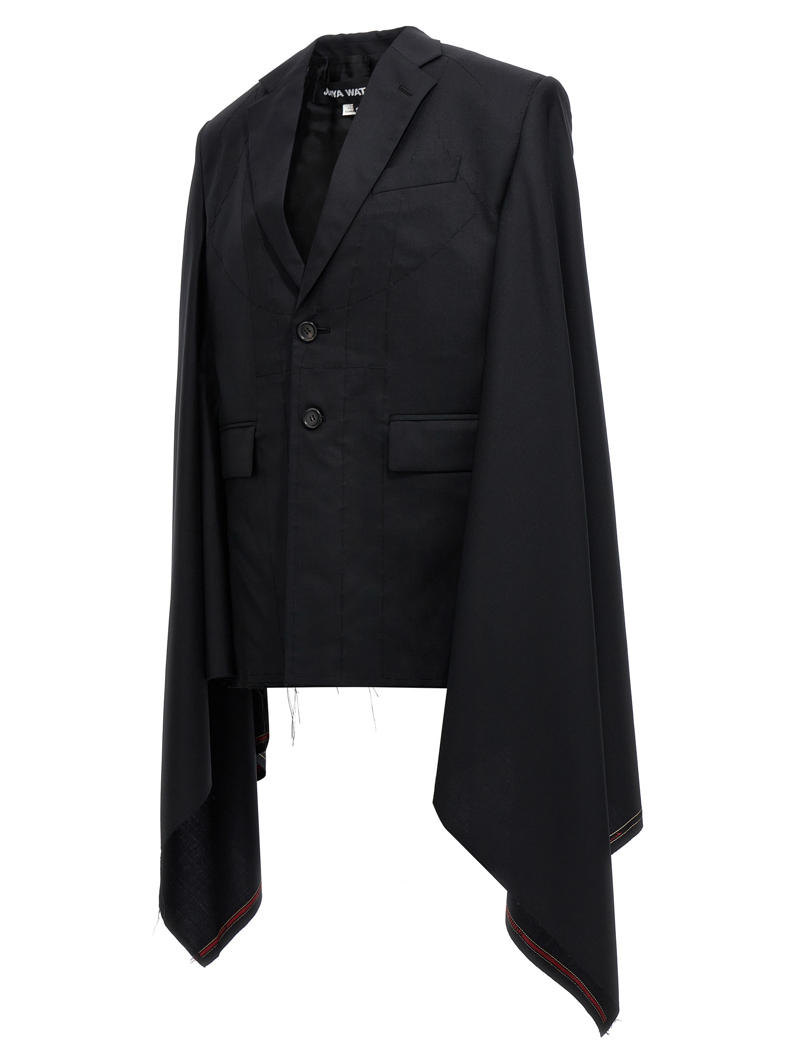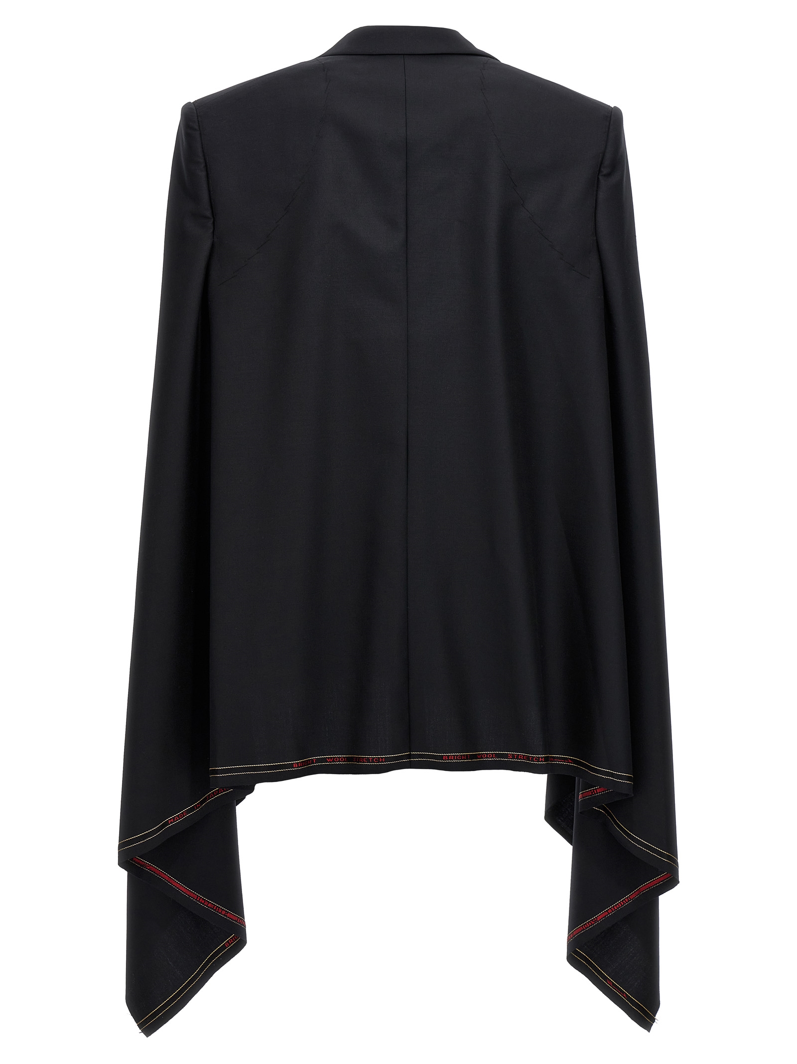 Wool cape with seized detail on the bottom hem, a button closure, pockets, padded shoulders, and wide sleeves.