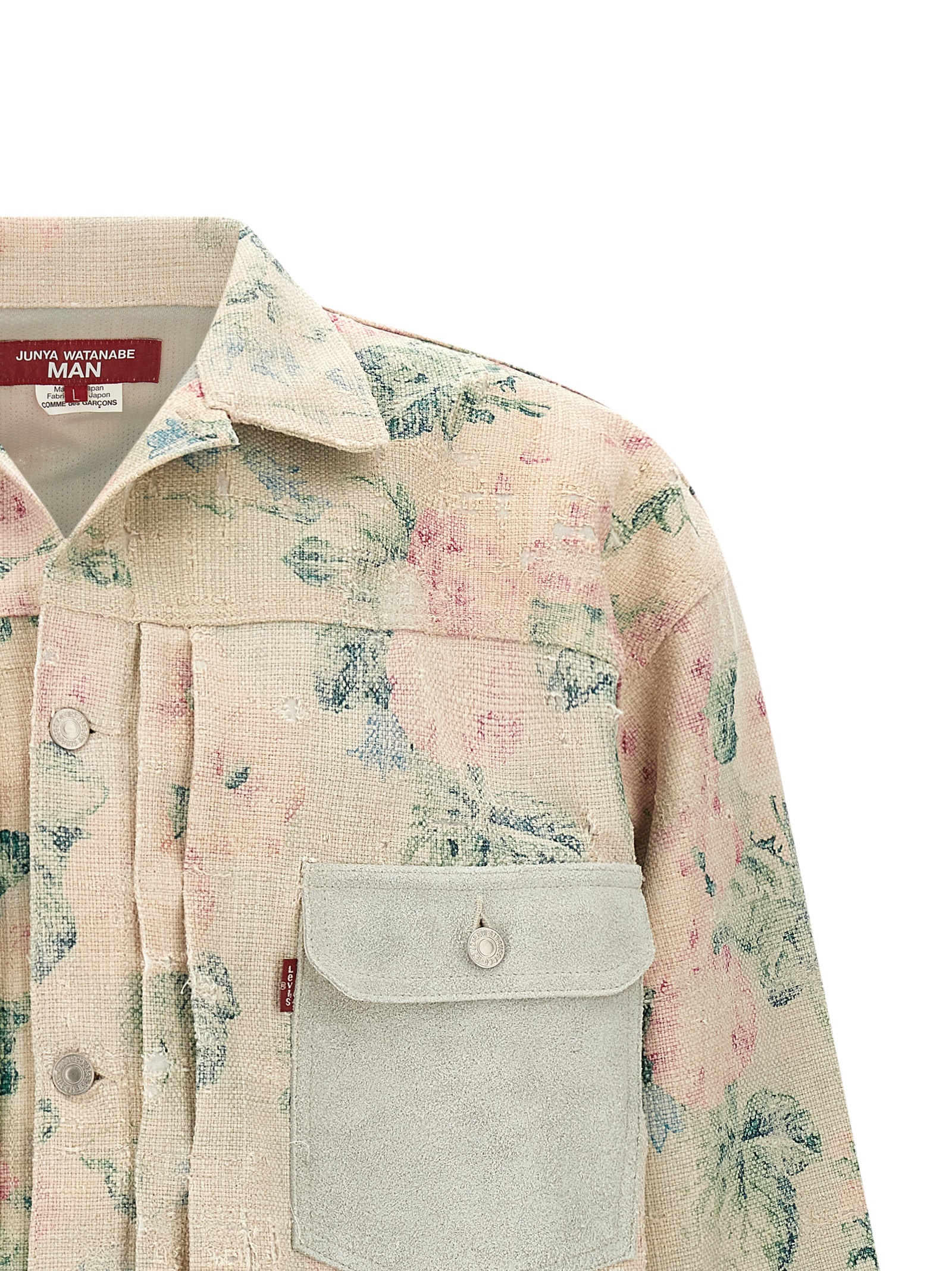 Junya watanabe x levi’s® jacket in floral patterned rayon and linen blend jacquard subjected to aging and breakage treatment, Front and back pincer, Shirt collar, Contrast suede pocket on the front, Front metal button closure, Long sleeves with cuffs and dropped shoulder, Mesh lining. Size and Fit – Comfort fit