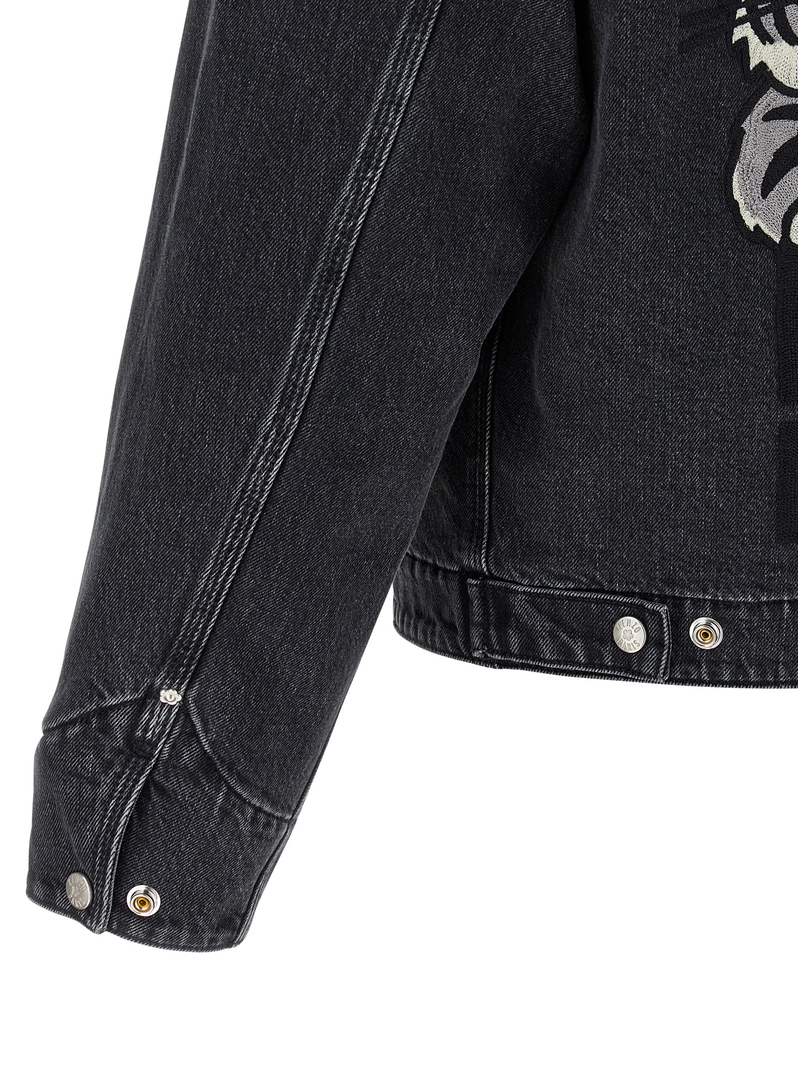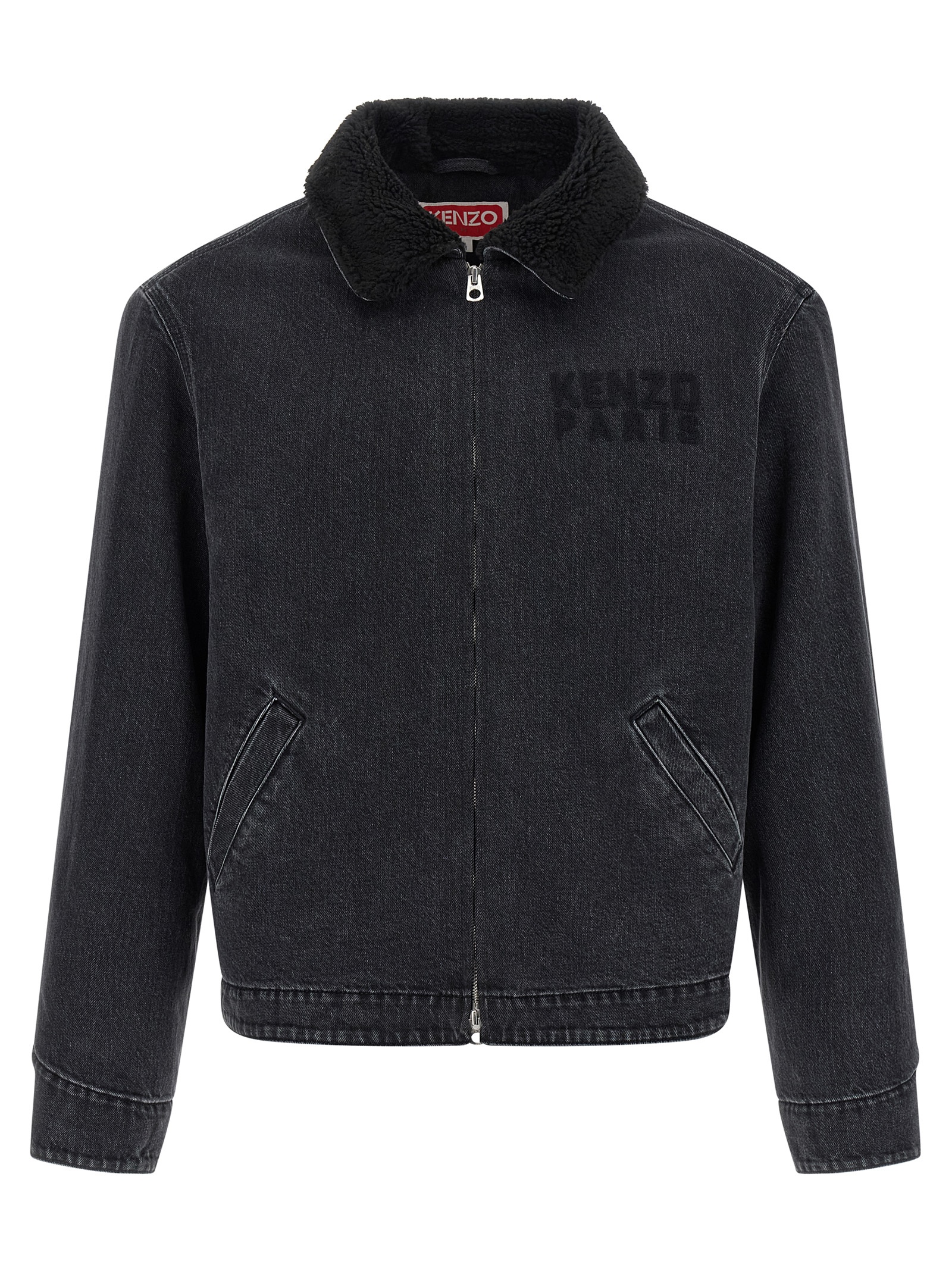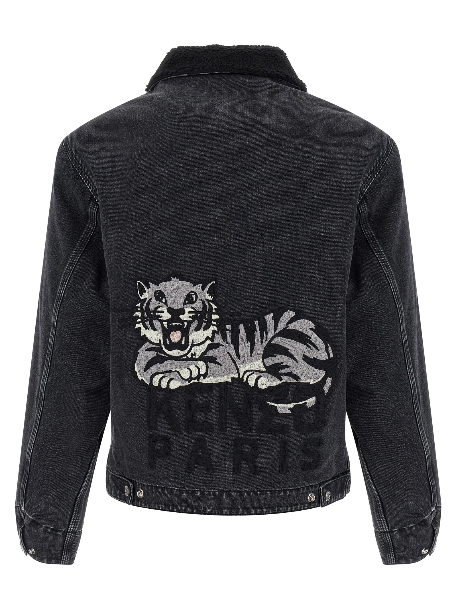 Japanese stone bleach wash denim jacket, teddy-effect fabric lining and collar, back ‘KENZO Happy Tiger’ embroidery, front zip closure, pockets, long cuffed sleeves.