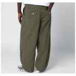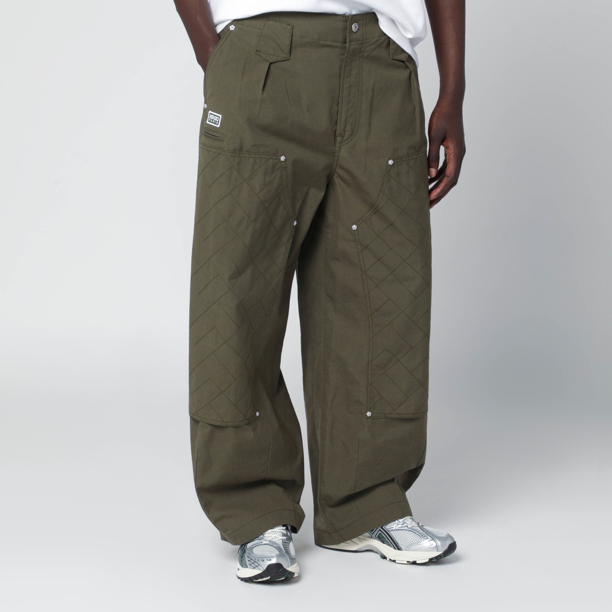 Wide-leg trousers by Kenzo in khaki green cotton, featuring front zip and button closure, belt loops, all-over flower-shaped rivets, quilted side inserts, logo lettering patch, and multiple welt and flap pockets on the front and back.