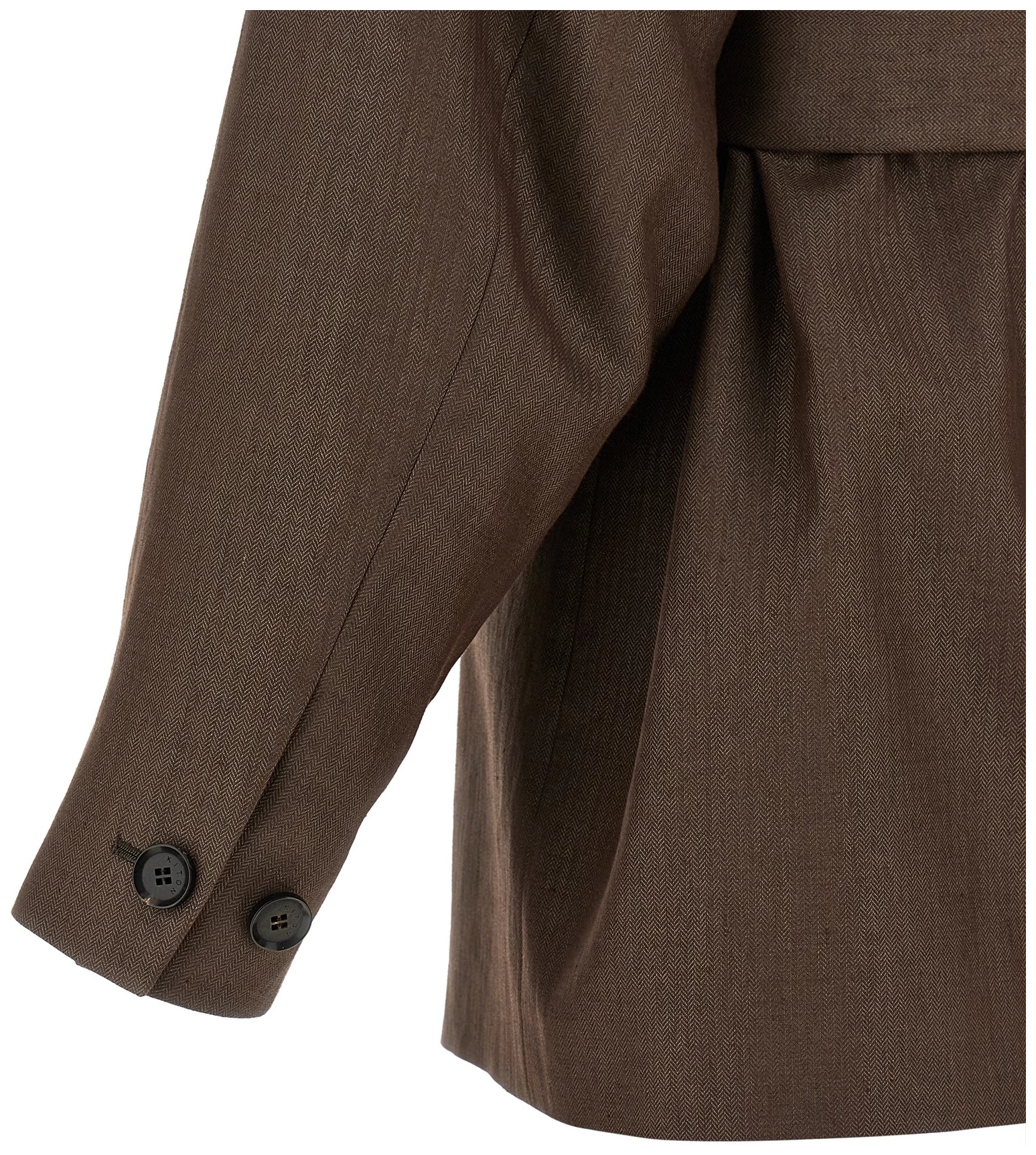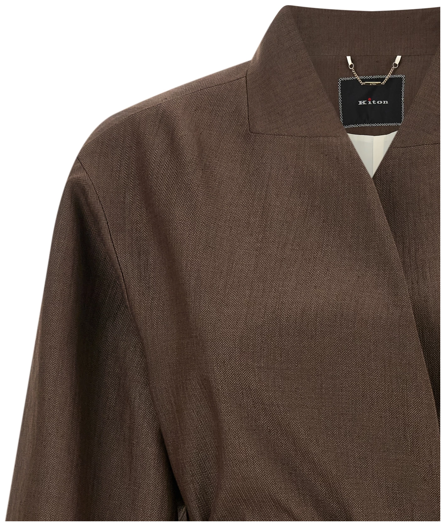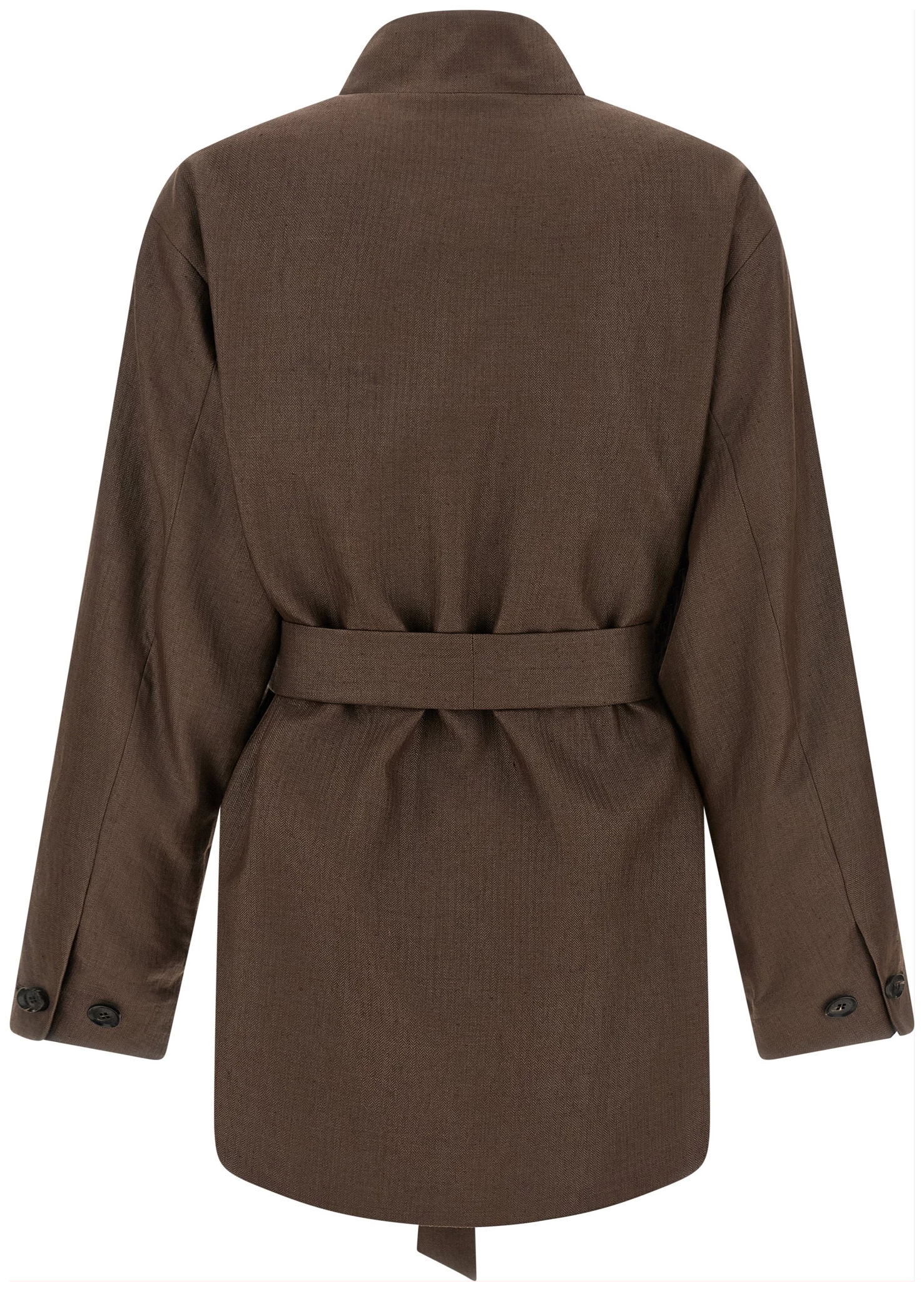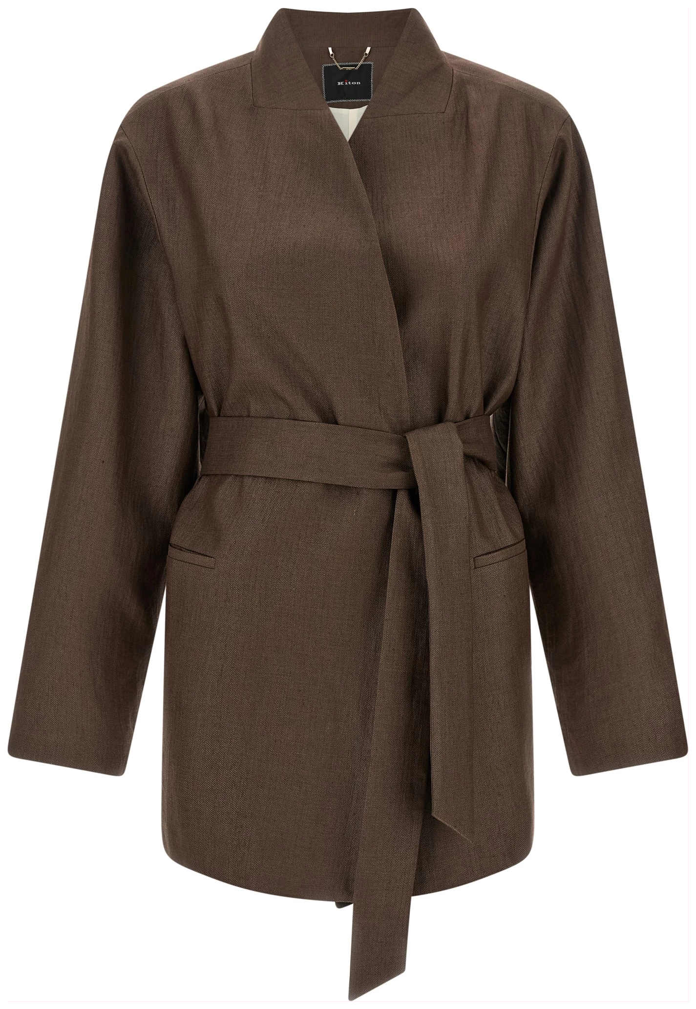Linen blend blazer with shawl collar and front incessed closure with knotted belt at the waist, Front welt pockets, Slightly dropped shoulder, Wide sleeves.