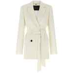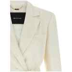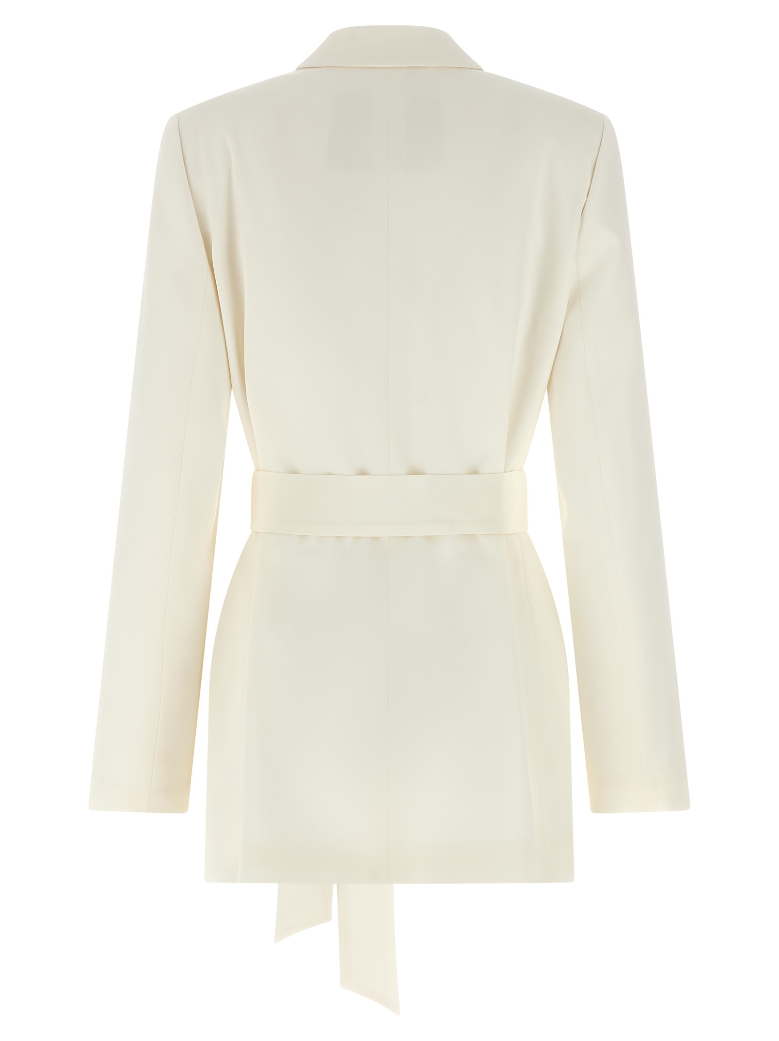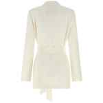 Double-breasted silk blazer with lapel neckline, Front closure with horn buttons, Structured shoulder straps, Long sleeves with buttons, And knotted belt at the waist. Size and Fit – True to size fit