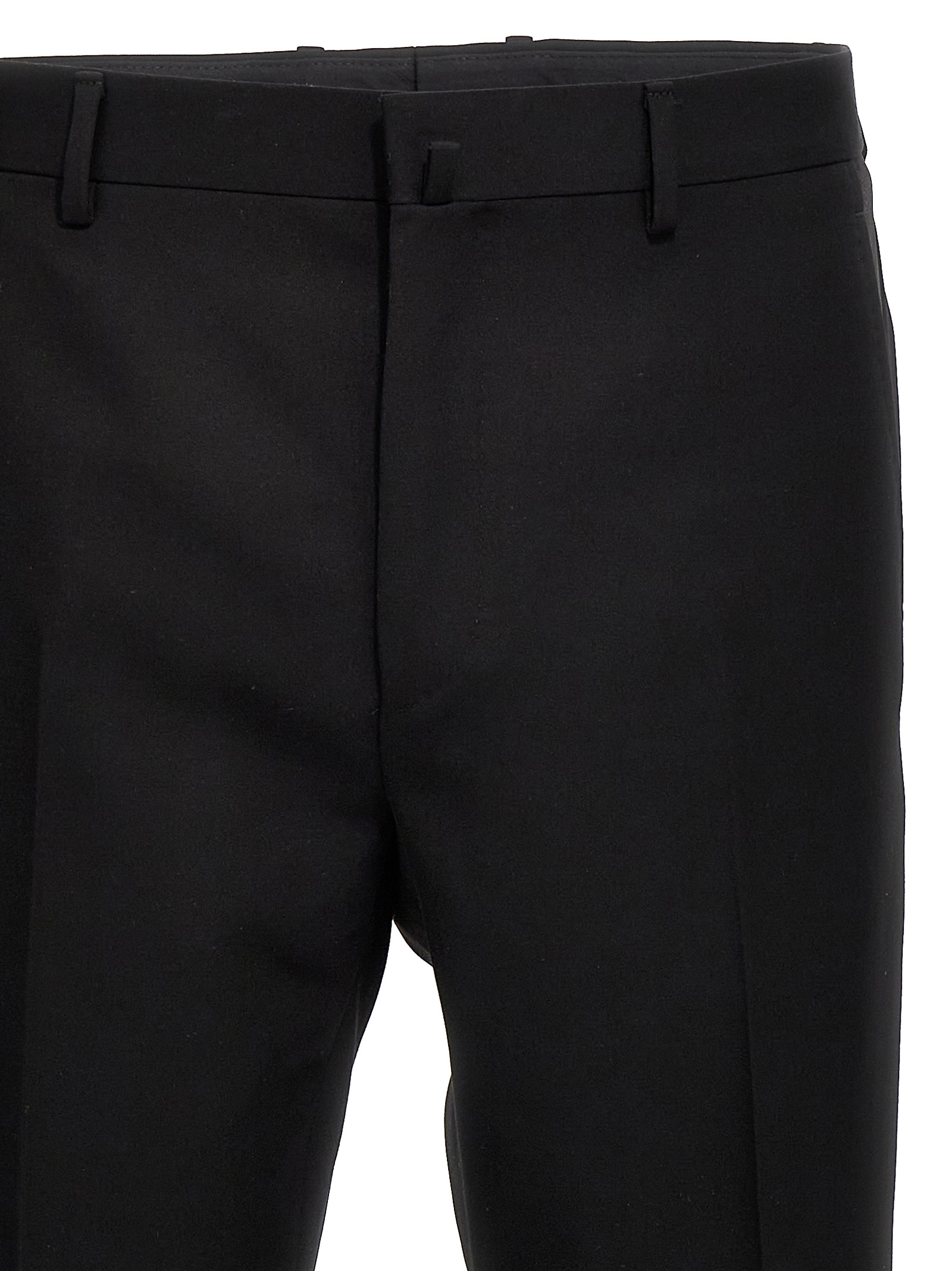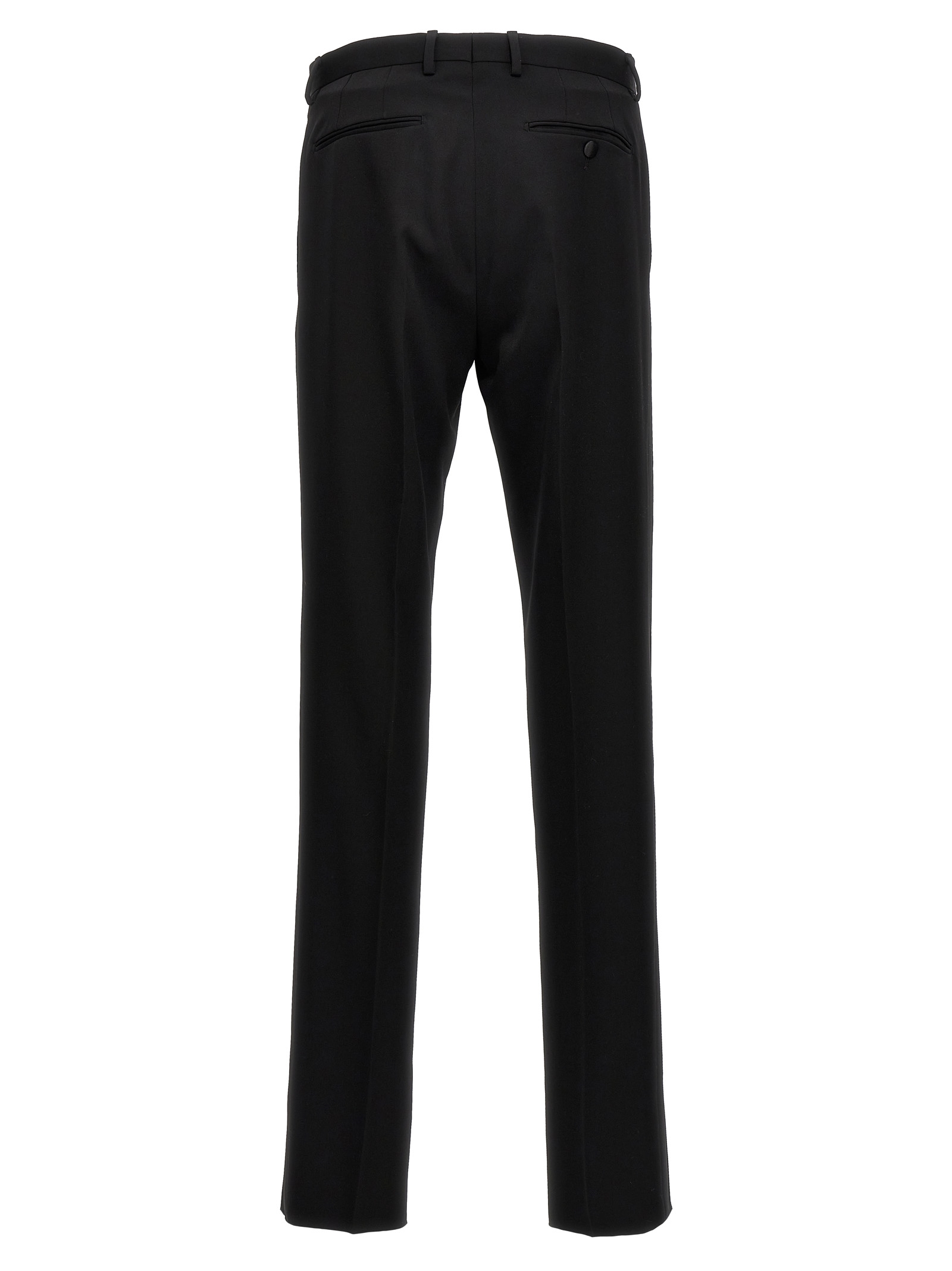 Tuxedo wool pants with satin side bands, Hook-and-eye zip and button closure, Pockets.
