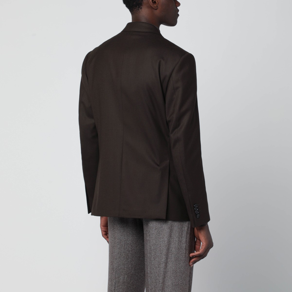 Lardini double-breasted jacket in brown virgin wool, featuring peak lapels, one welt pocket on the chest, long sleeves with buttoned cuffs, two front flap pockets, and double back vent.