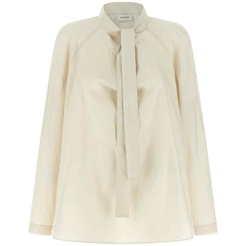 Cotton and silk blend shirt washed by the soft and smooth hand, Ascot collar to tie at the front or leave loose, Long raglan sleeves.