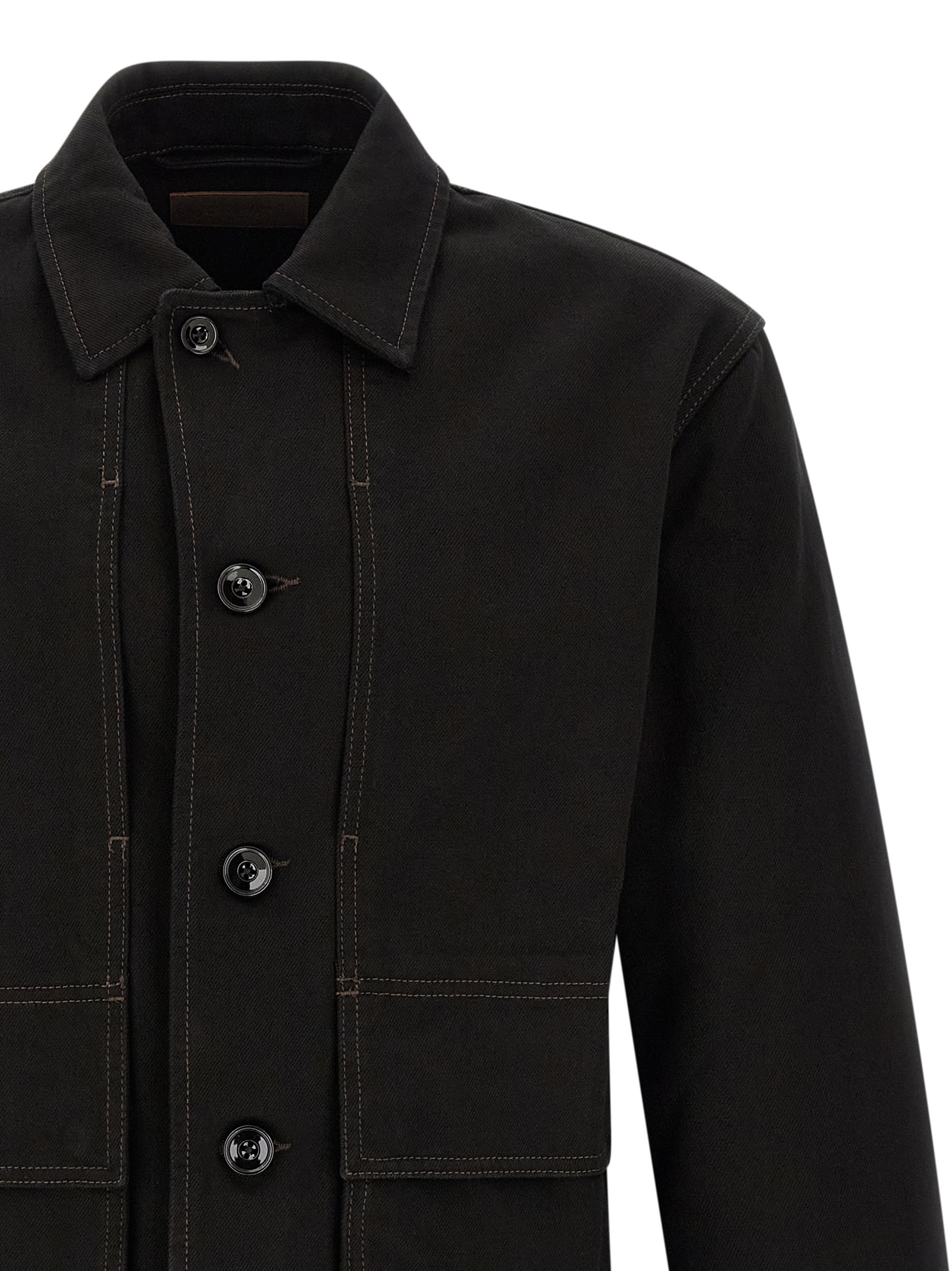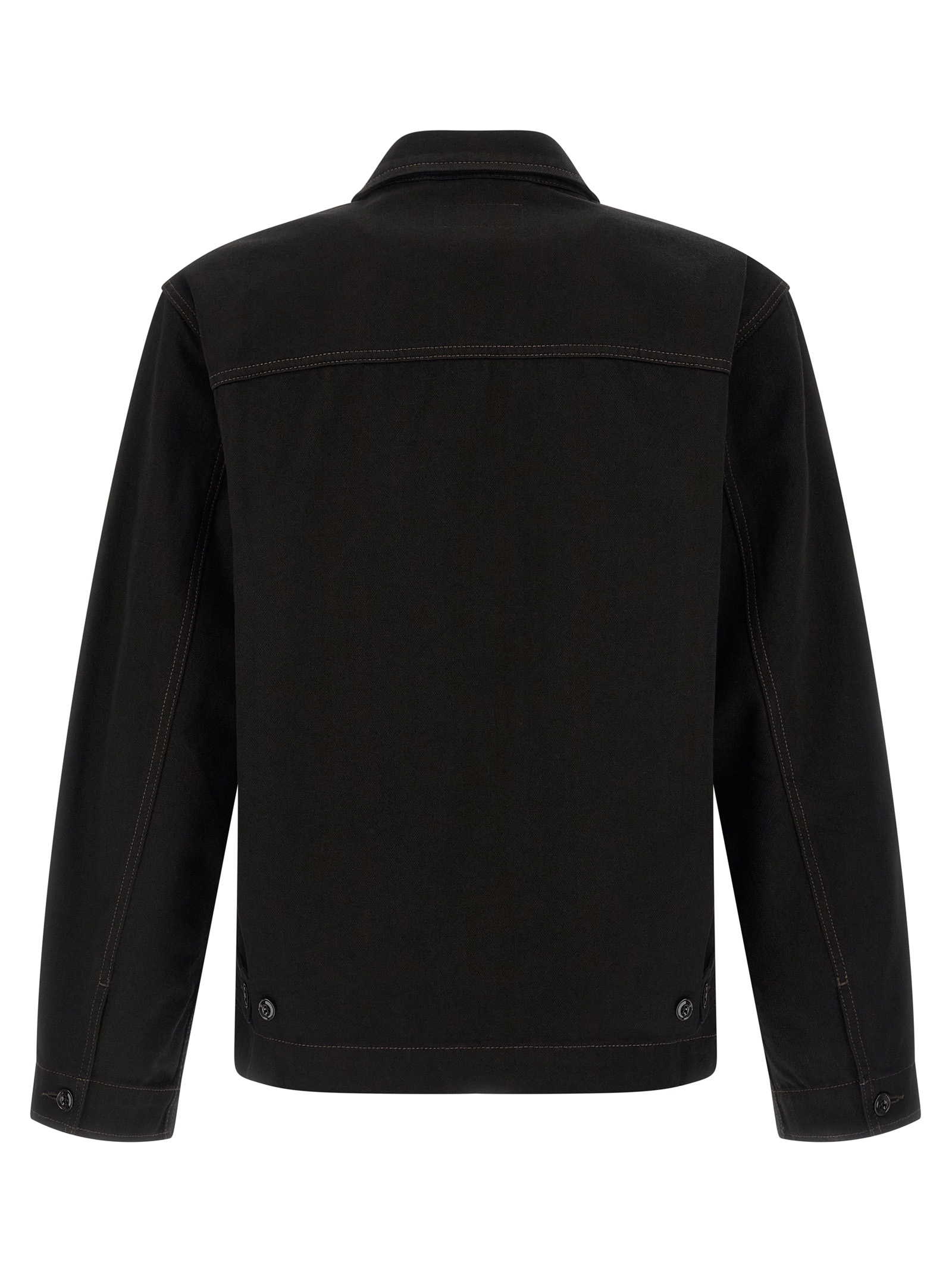 ‘Boxy’ jacket in heavy cotton denim with deep black wash, contrast stitching, workwear style, square silhouette, shirt collar, front button closure, pockets, long sleeves with cuffs and dropped shoulder, unlined.