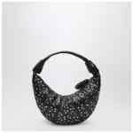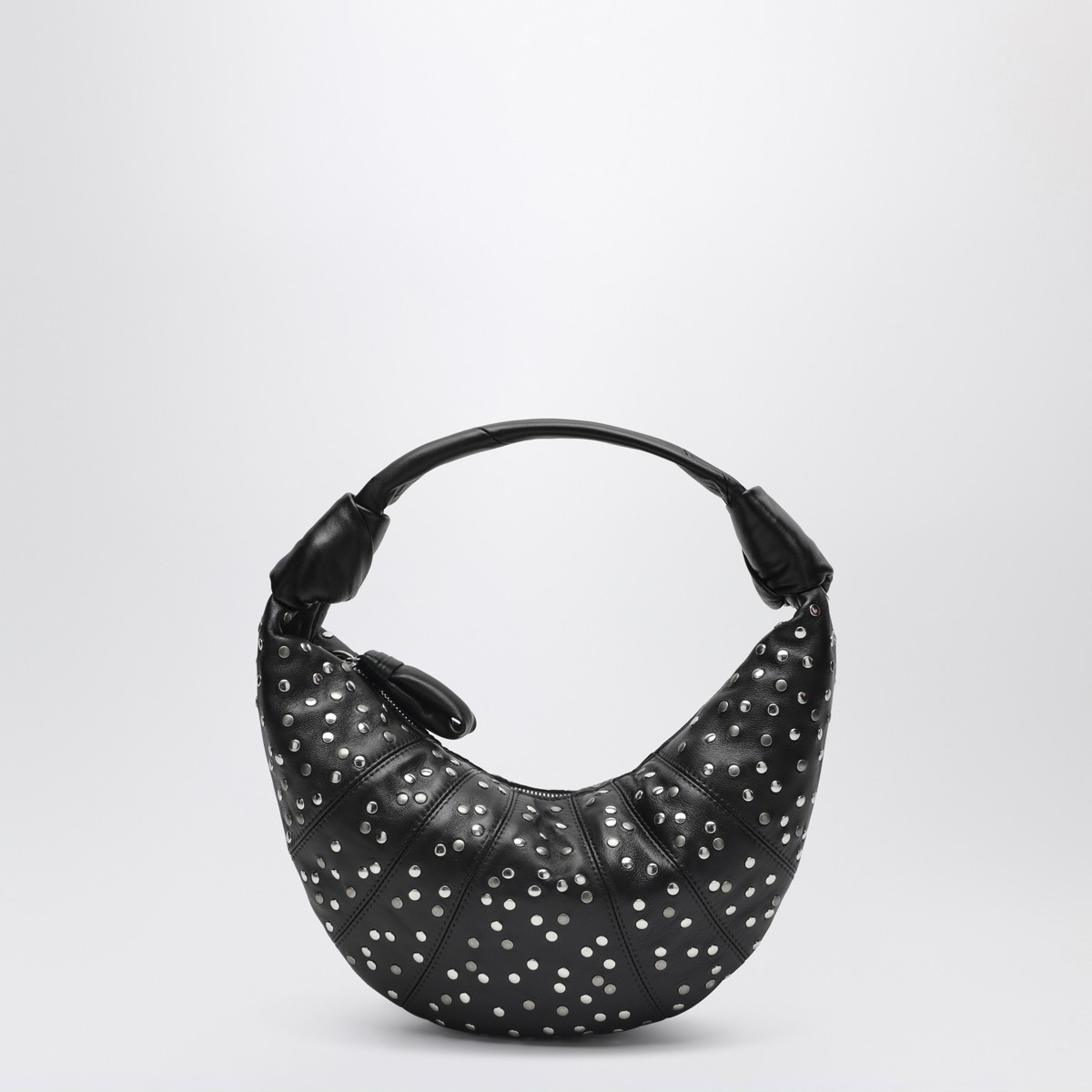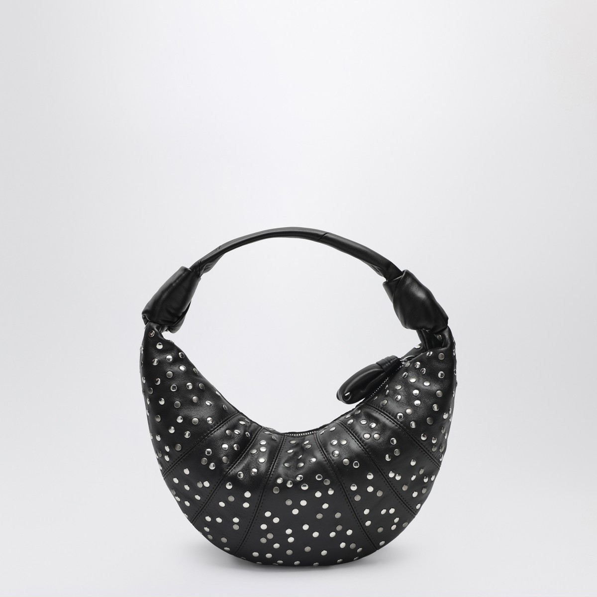 Lemaire bag in dark brown leather with small flat studs all over, featuring a zip closure, one internal flat pocket, croissant-shaped design, and silver-tone metal hardware.