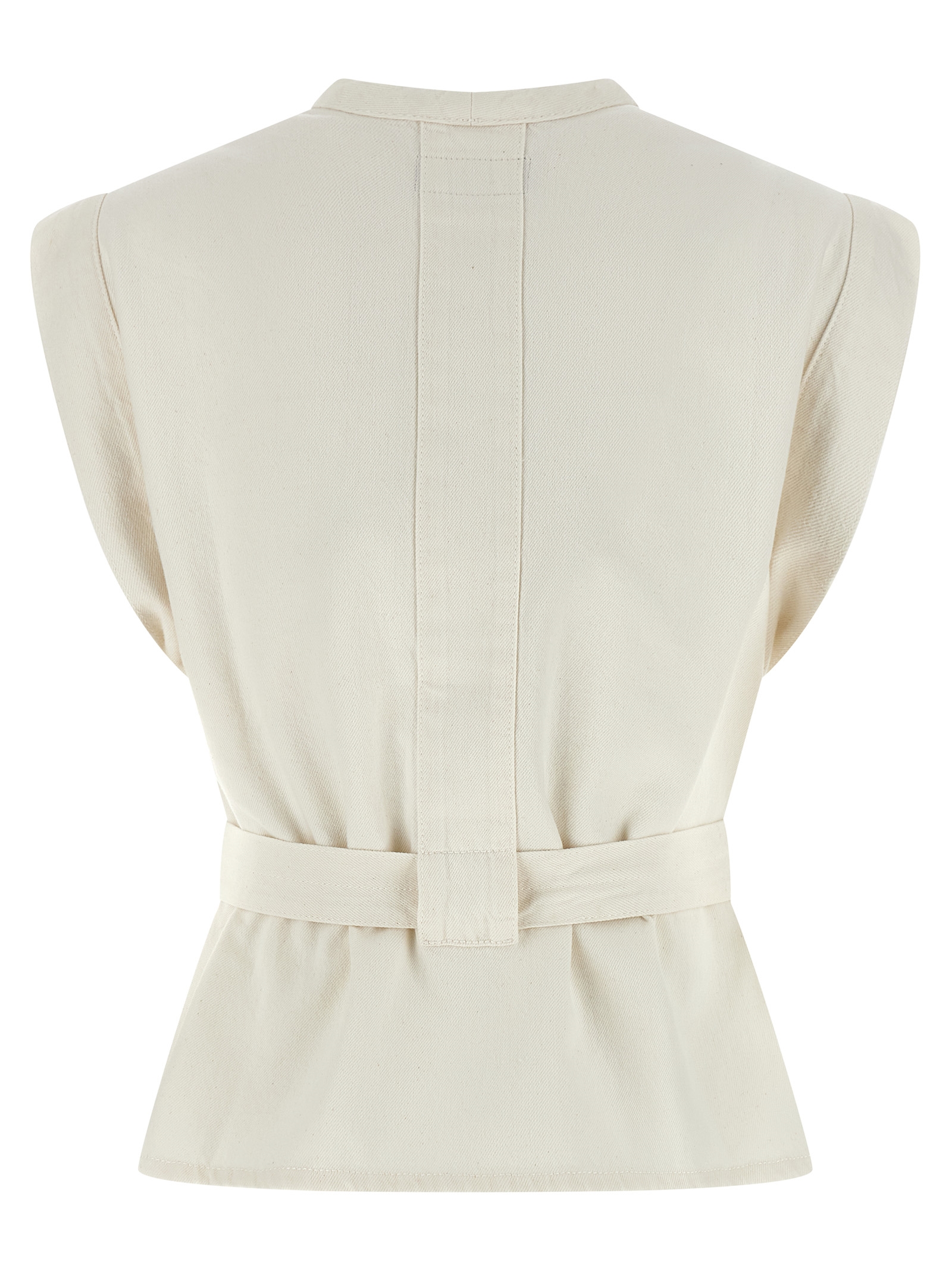 Chasuble’ denim vest with exposed twill texture and intense wash, Contrast stitching, V-neck, Wide armholes, Side slits, Removable matching belt.