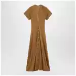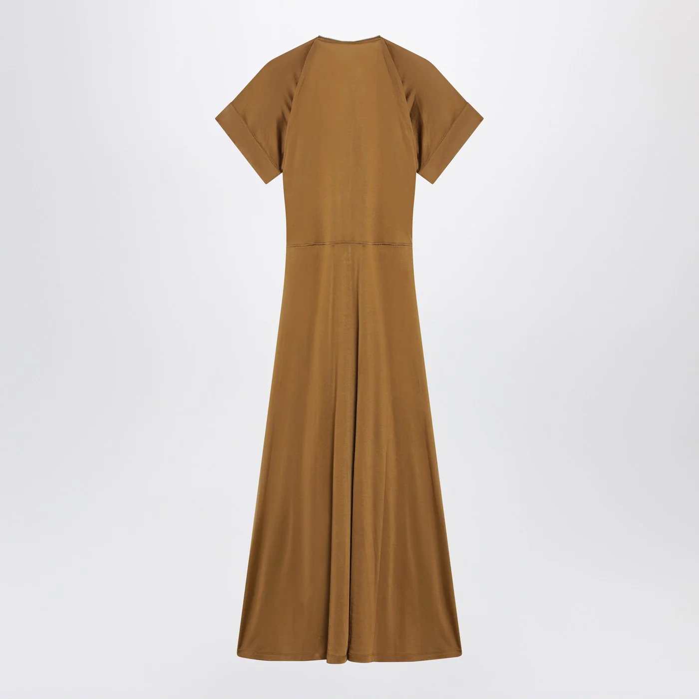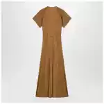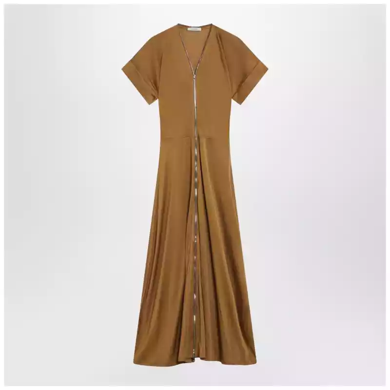 Long dress by Lemaire in cinnamon brown cotton and viscose jersey Front double zip closure Short flared sleeves Slim fit V neck. Size and Fit – Model wears size S Model measurements: Height: 182 cm Chest: 79 cm Waist: 62 cm Hips: 90 cm