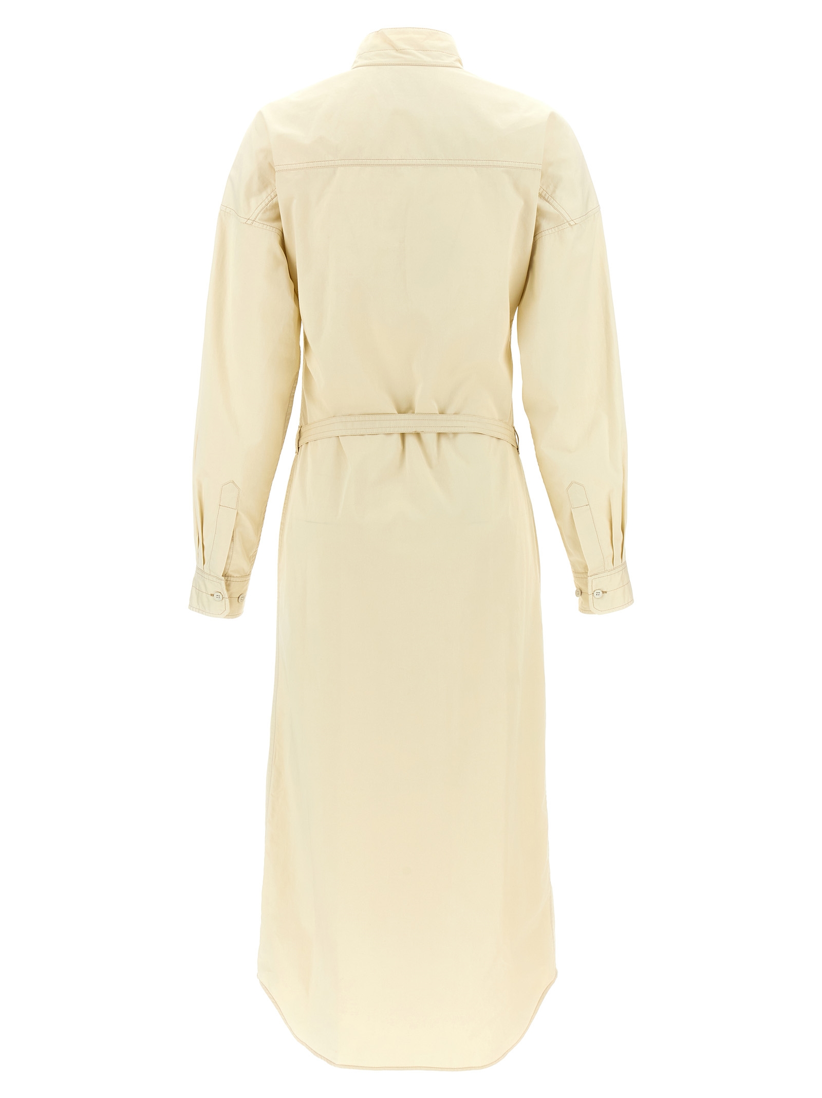 Light cotton satin midi dress with chemisier style, high neck, front button closure, long cuffed sleeves, pockets, removable pocket belt.