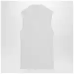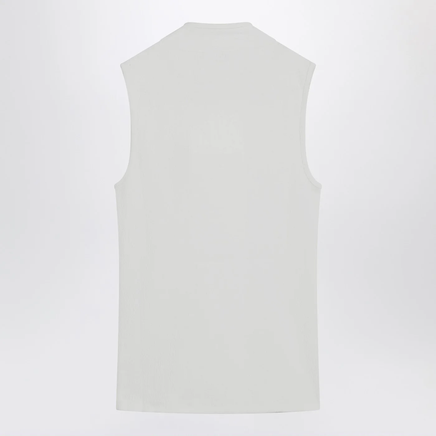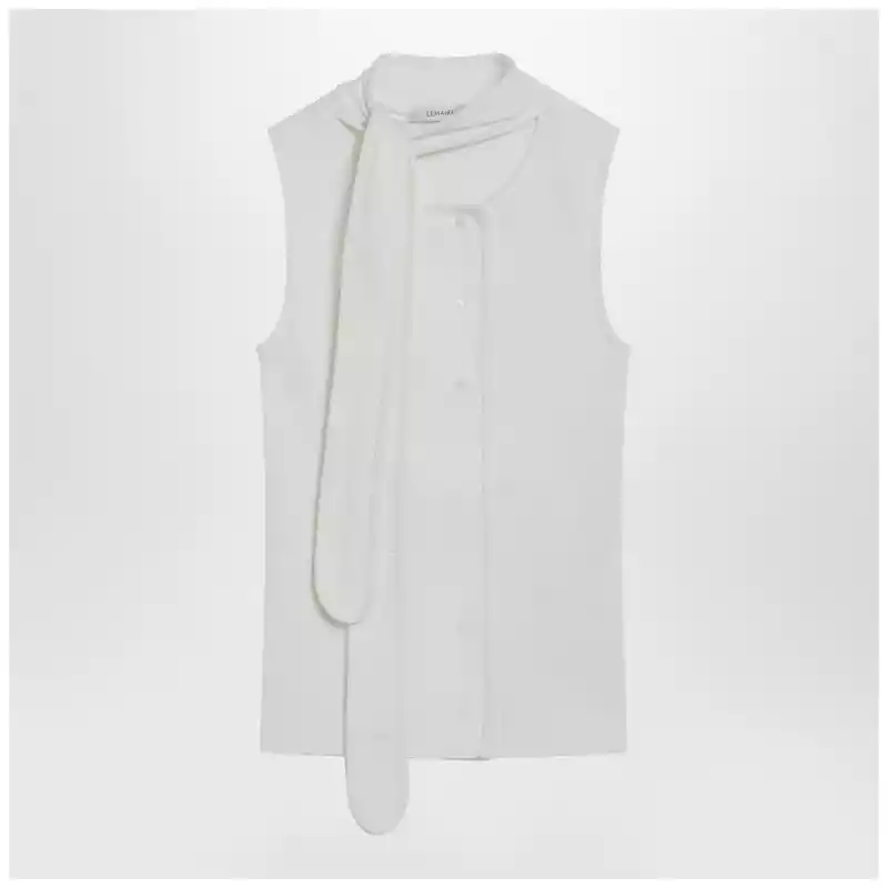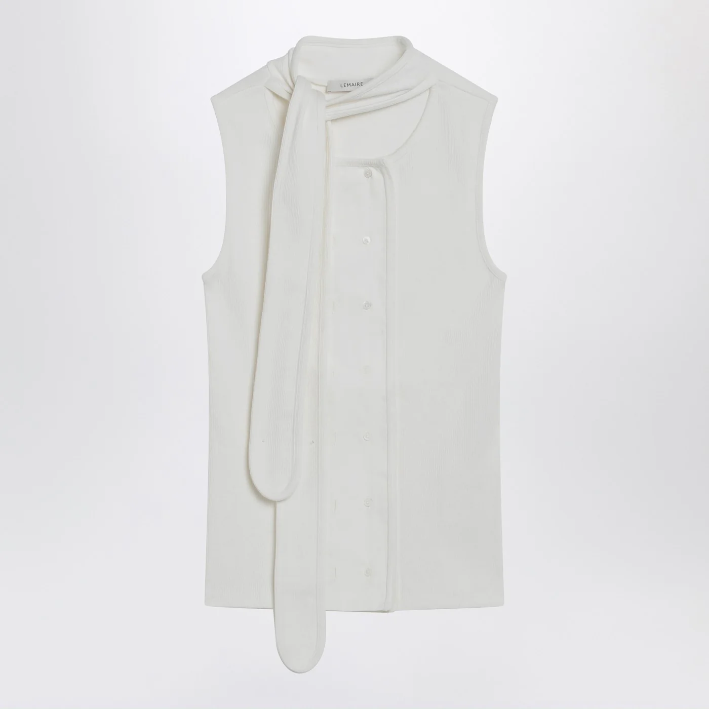 Sleeveless crew neck top by Lemaire in milk white cotton and linen blend jersey Ribbed design Scarf to tie at the neck Double front button closure Slim fit. Size and Fit – Model wears size S Model measurements: Height: 182 cm Chest: 79 cm Waist: 62 cm Hips: 90 cm