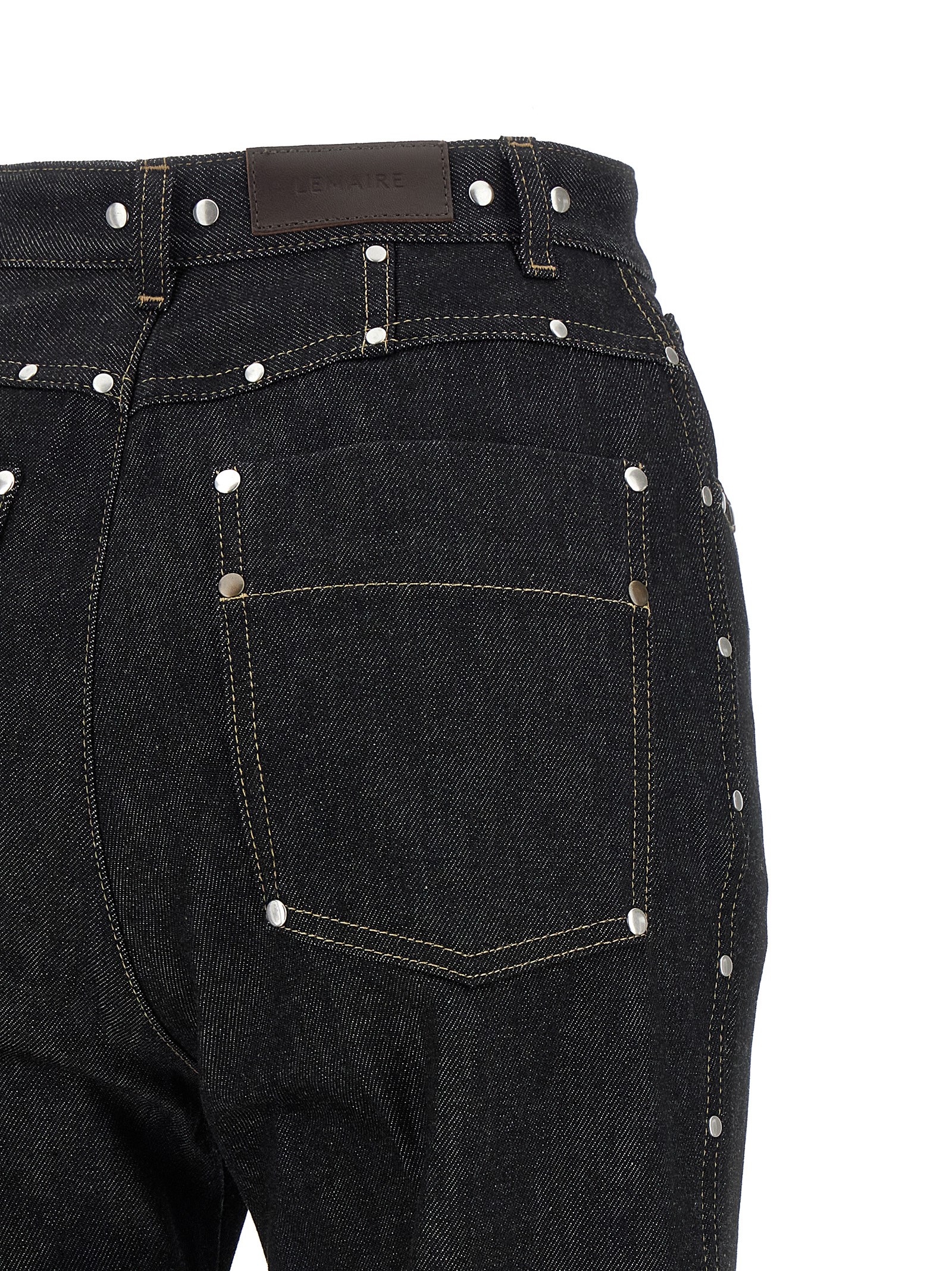 Heavy denim jeans with metal rivets of different sizes, Contrast stitching, High waist, Straight leg, Stretched pleat, Front zip and button closure, Five pockets, Leather logo label with embossed logo at the back. Size and Fit – True to size fit – lemaire size