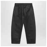 Lemaire chocolate brown shiny cotton denim pants, featuring a front zip and button closure, belt loops, two welt pockets, two patch pockets on the back, and a side welt pocket.