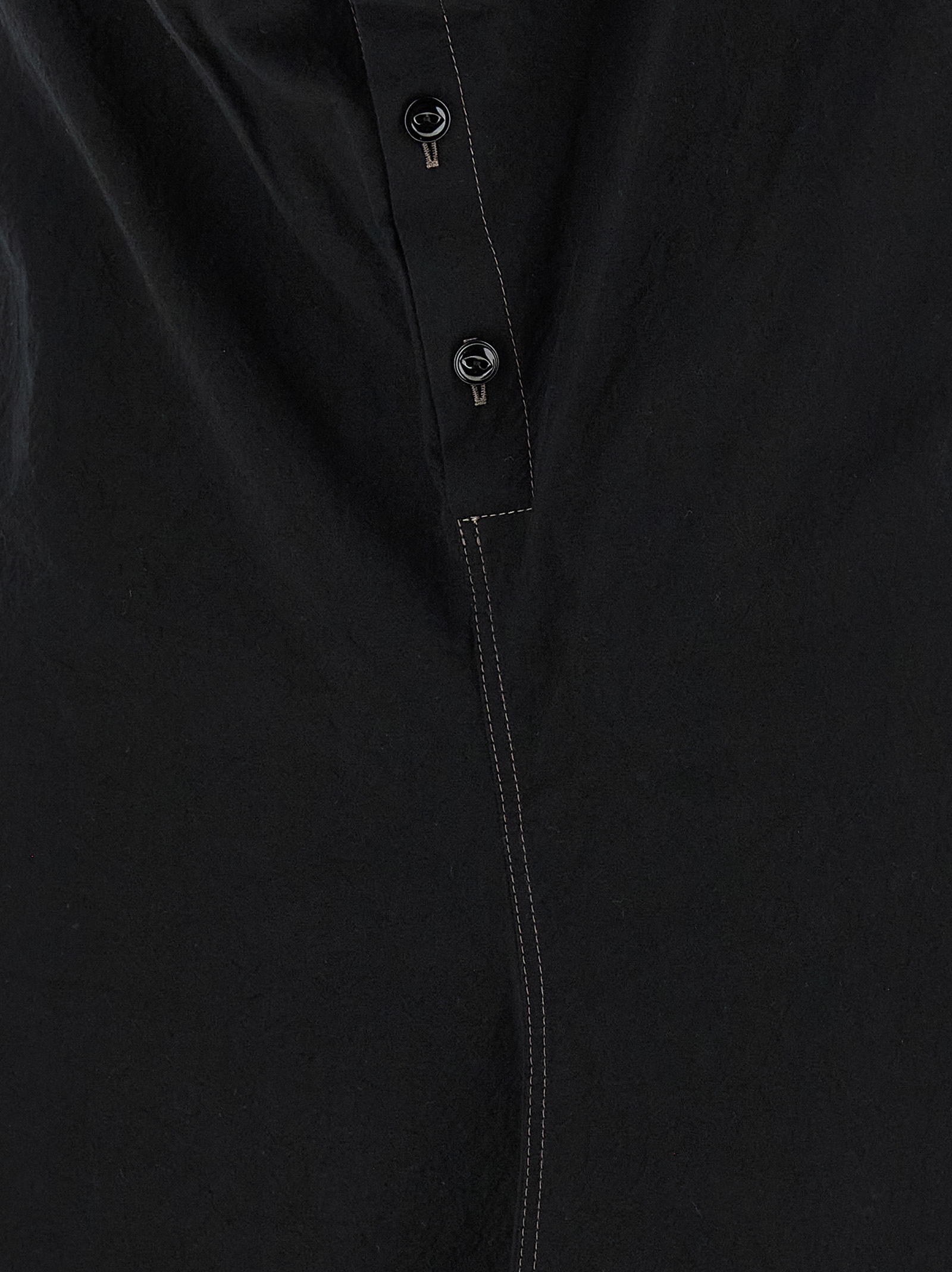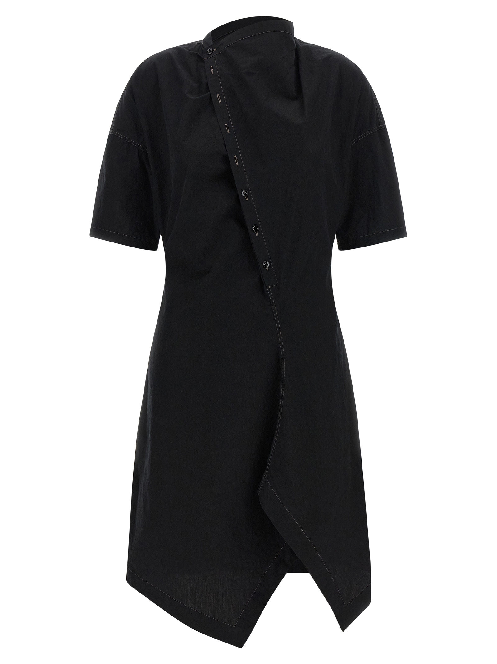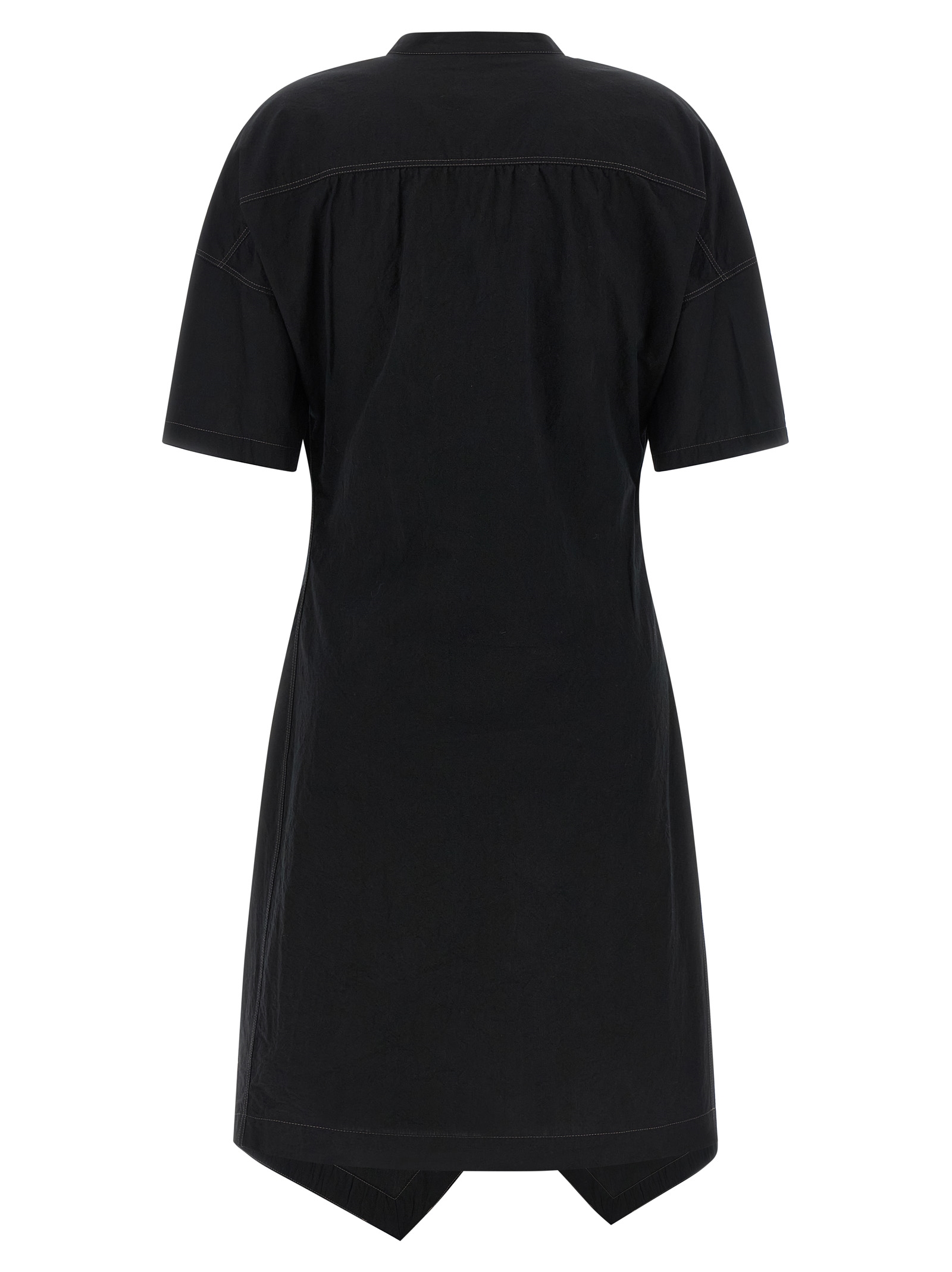 Soft collar’ asymmetrical midi dress in cotton crêpe with round and draped neckline with button closure, Side split, Contrast stitching, And short sleeves.